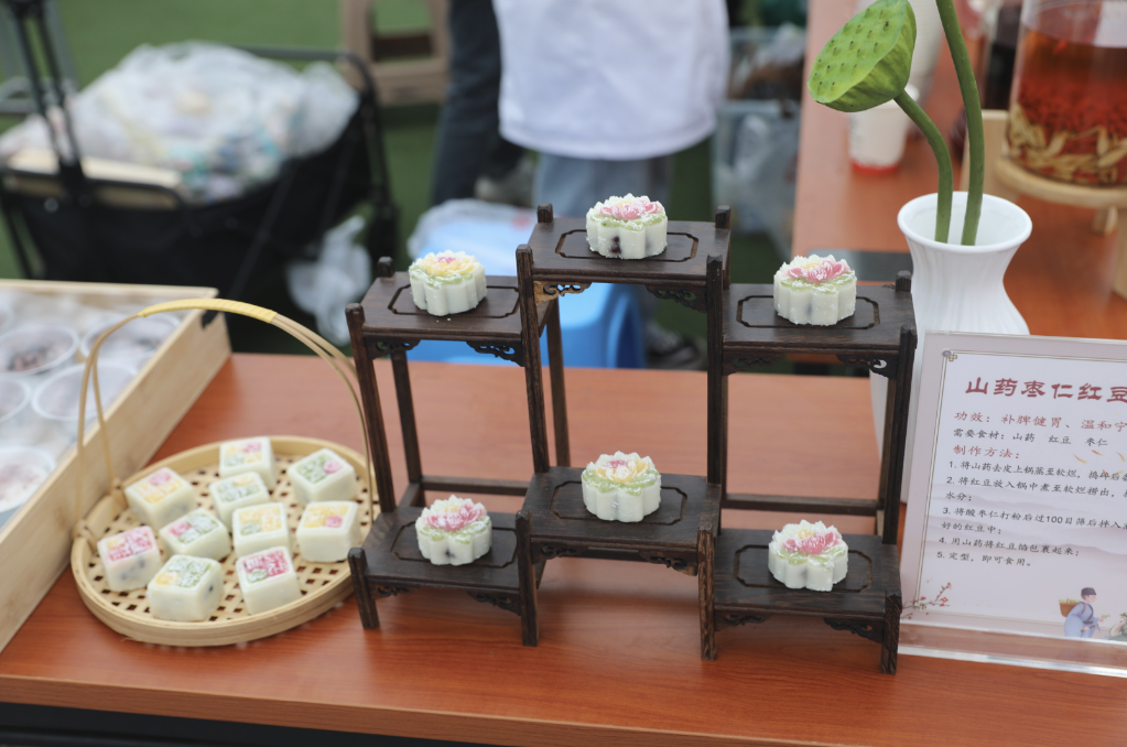 市集内容丰富、形式多样,让中医药文化可观可感、可品可学。现场精心准备降糖饮、滋补饮、清肝明目饮等特色中药茶饮,八珍糕、茯苓玫瑰糕、山药糕等“药食同源”药膳糕点供群众免费品尝,工作人员现场讲解养生功效。中草药辨识、中药香囊制作等互动体验深受欢迎;红日药业展示中医药特色产品;中医文创产品集中展出,八段锦养生功法现场展演,充分展现中医药文化的独特魅力。