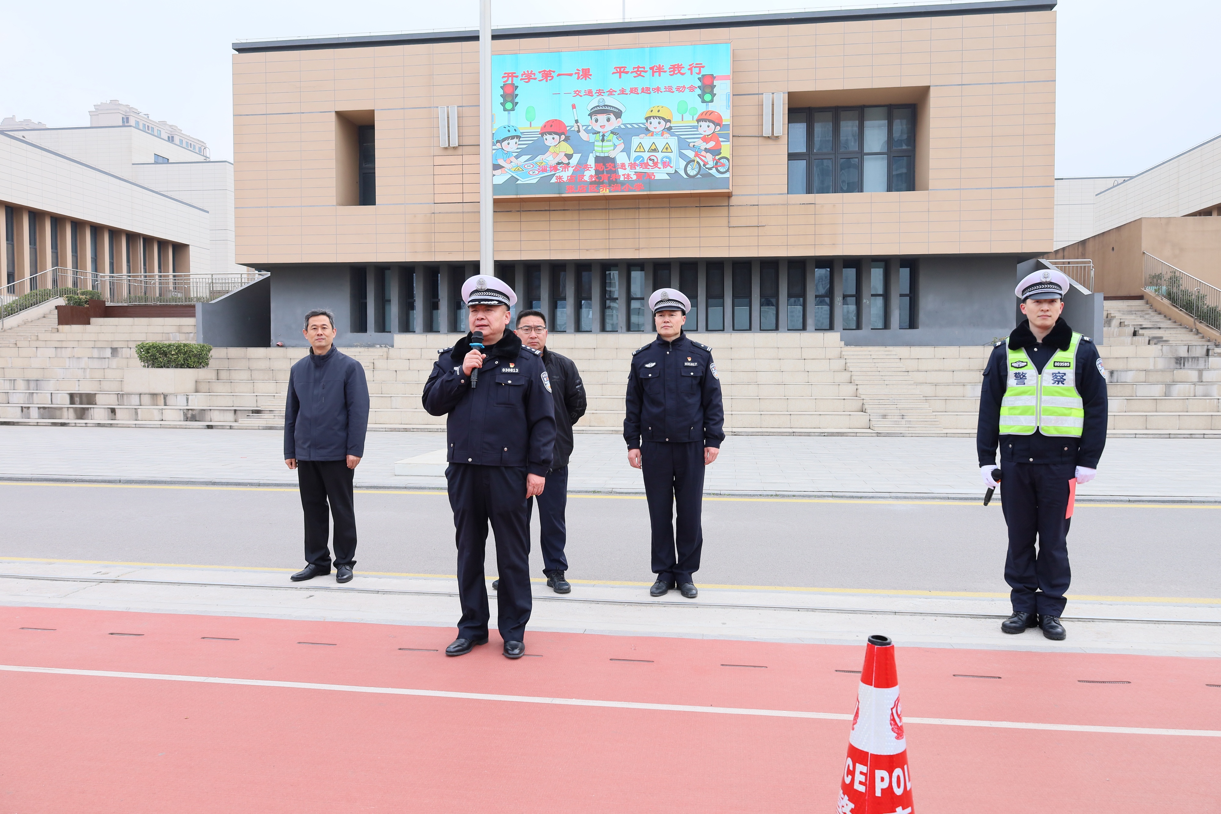 本次活动以“知危险 会避险 安全文明出行”为核心主题,将交通安全知识与趣味运动深度融合,创新交通安全教育形式。活动开幕式上,主持人介绍了活动目的与流程,学校领导在致辞中强调了新学期安全的重要性,叮嘱全体学生将交通安全牢记于心、付诸于行。交管支队综治大队领导为同学们讲解校园周边出行安全要点,用通俗易懂的语言普及日常出行的安全常识。学生代表宣读《交通安全倡议书》,带领全体同学共同许下文明出行的承诺,随后张店区教体局安全负责人宣布交通安全主题趣味运动会正式开始。