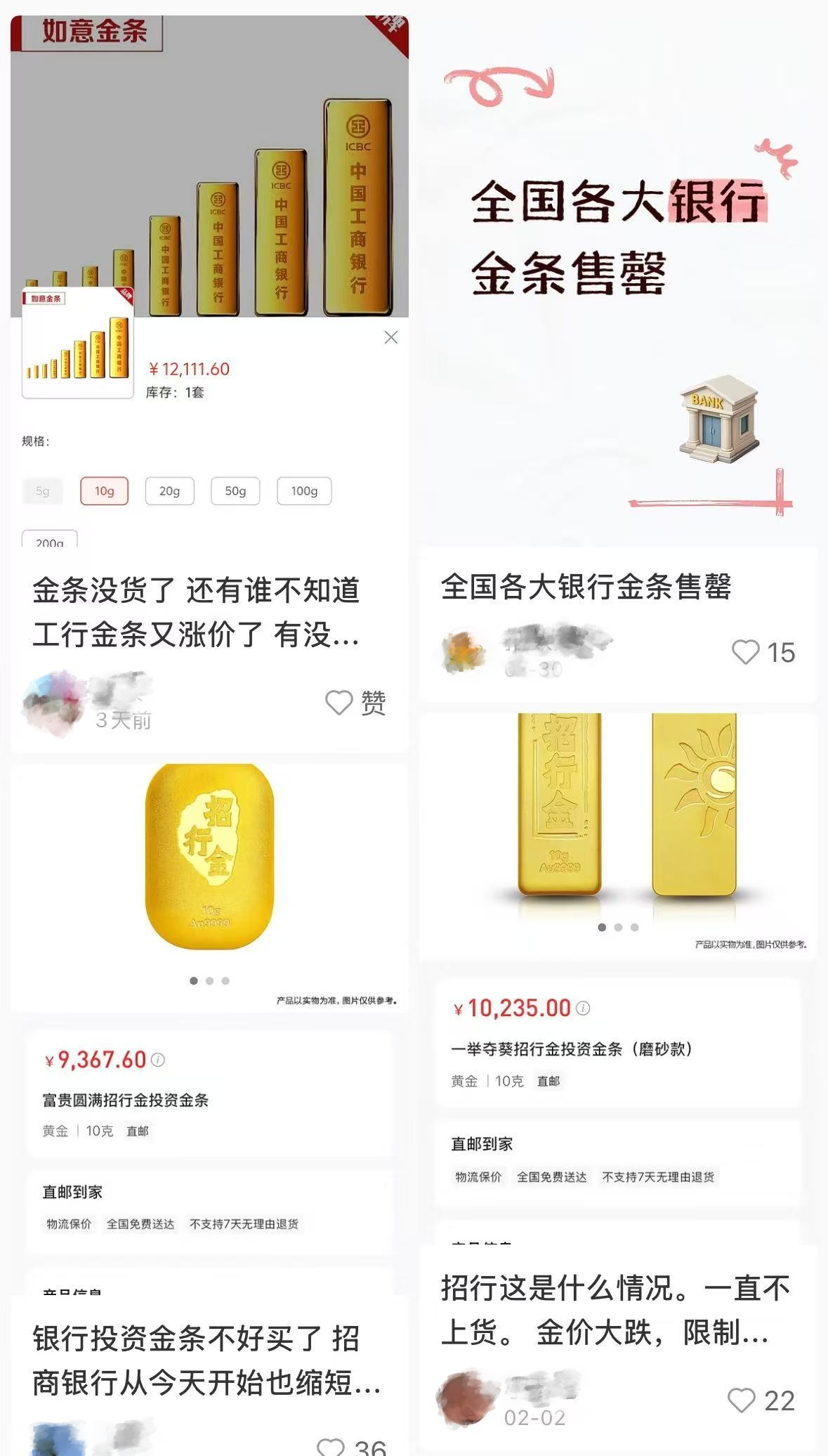 有网友表示不解:“实物黄金怎么一直售罄?黄金价格都还没企稳!到底是谁这么猛买!”也有网友讲述了自己抢购未果的经历:“早上开了个会,点进去发现显示‘所在开户行不支持购买’——估计是广东地区指标卖完了,下午直接都没得买了。”