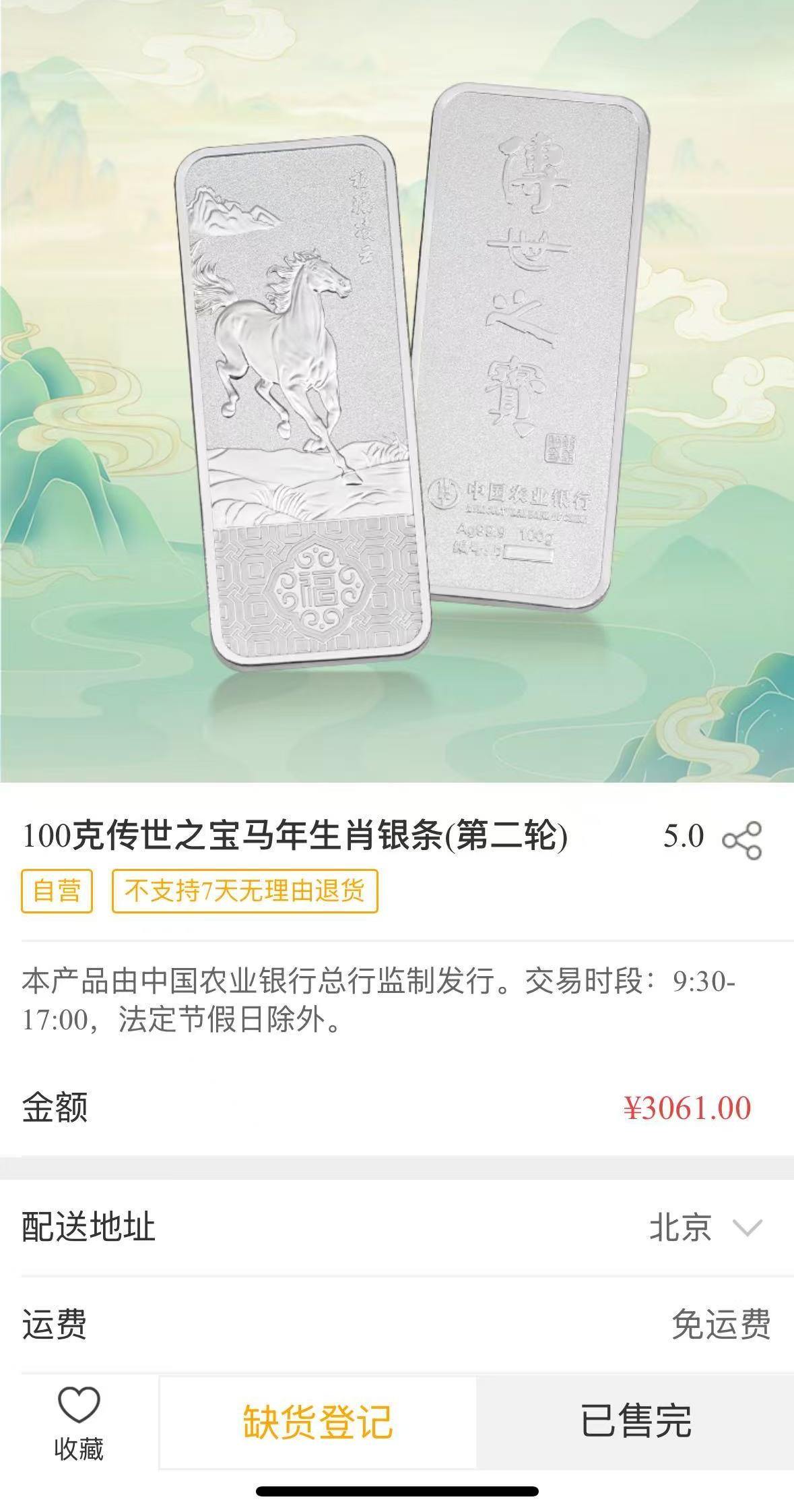 不仅金条抢手,该行3克“传世之宝鸿福有余银鱼”和100克“传世之宝马年生肖银条”也显示已售完,足见当前贵金属投资之热。