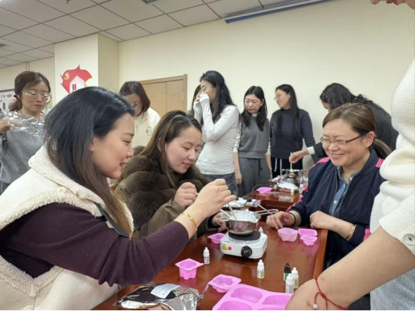 在创意手工皂制作环节,活动现场准备了天然皂基、精油、香氛、模具等丰富材料,老师详细讲解手工皂制作步骤与技巧。大家认真学习、动手实践,从原料配比、香氛调配,到装饰点缀,一步步精心创作,一块块造型精美、香气清新的手工皂陆续成型。大家互相交流、分享创意,在动手实践中释放压力、收获喜悦,既提升了动手能力,又增强了仪式感与幸福感。