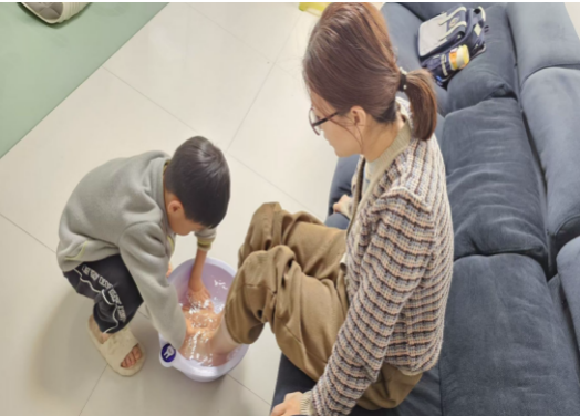 感恩于心,践之于行。活动中,孩子们不仅用文字和画笔表达爱意,更化身“小小感恩家”,用力所能及的行动传递温暖与孝心。他们主动为妈妈捶背揉肩,缓解长辈一天的疲惫;端来一盆温水,为长辈洗去一身辛劳;自觉收拾碗筷、整理房间,用一双双小手为家人分担家务;一个温暖的拥抱、一句贴心的问候,看似微小的举动,却饱含着孩子们对长辈最朴素的爱与感恩。