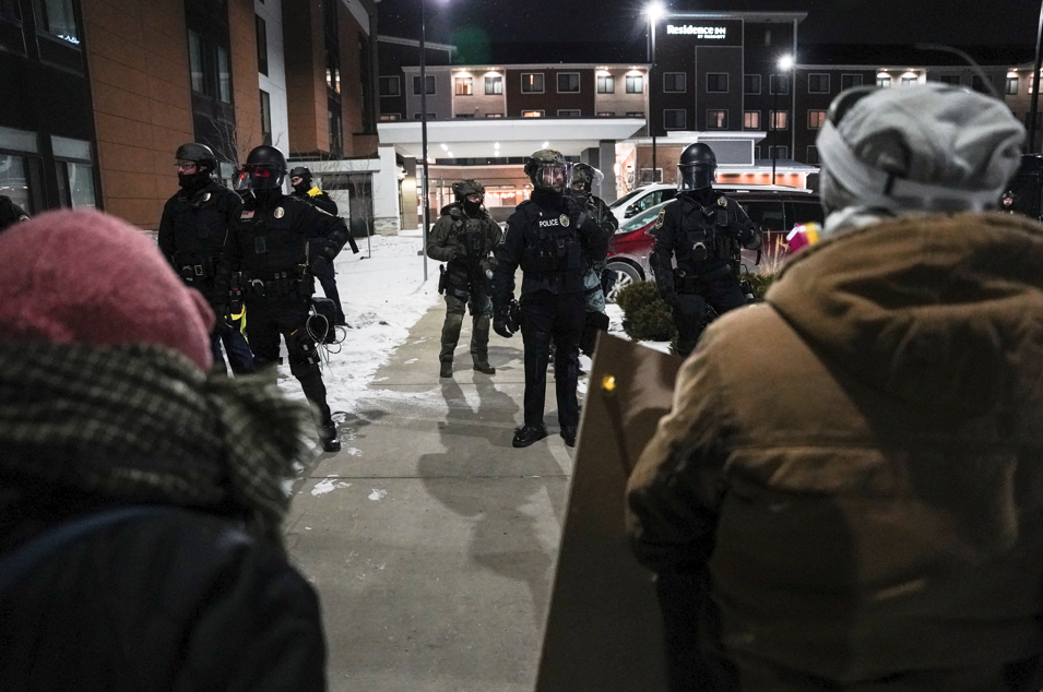 1月26日,在美国明尼苏达州,抗议人群在一家酒店外与执法人员对峙。 新华社