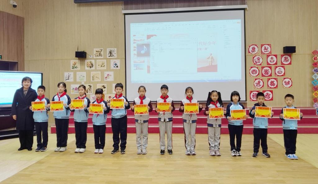 追“锋”少年行,志愿我先行。四年级各中队联合演绎情景剧《追“锋”少年行》。剧情生动再现了寒假期间“五小”志愿服务的温暖瞬间:小小楼栋长、小小啄木鸟、小小传播员、小小勤务员、小小传承人——五个片段,五个缩影,展现着雷锋精神在校园内外的生动实践。同时,学校表彰了寒假期间在社会实践和志愿服务中表现突出的班级,授予“星火中队”与“微光中队”荣誉称号。
