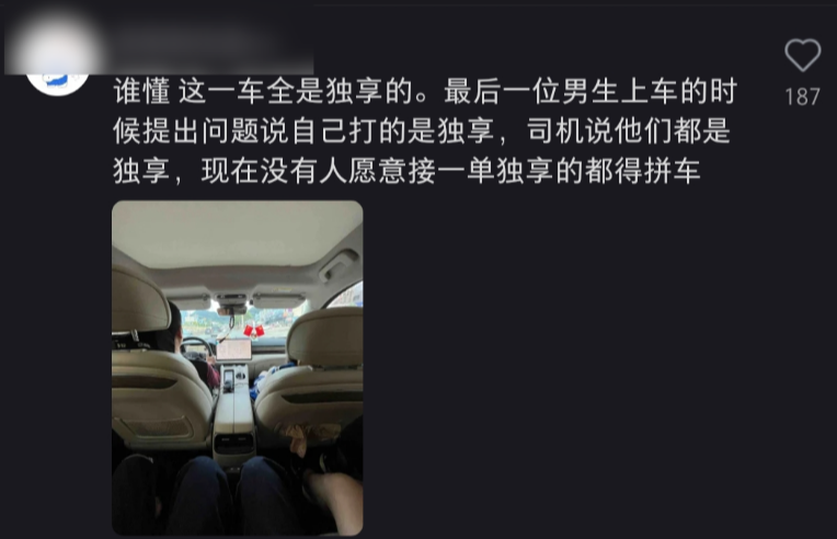 记者调查发现,王女士的遭遇并非个例。社交平台上,相关吐槽比比皆是。“一个时间段给司机派两个独享单,直接两个独享变拼车”“选择独享,看中的是优惠价格和直达的私密空间,但现在意义完全变了”。