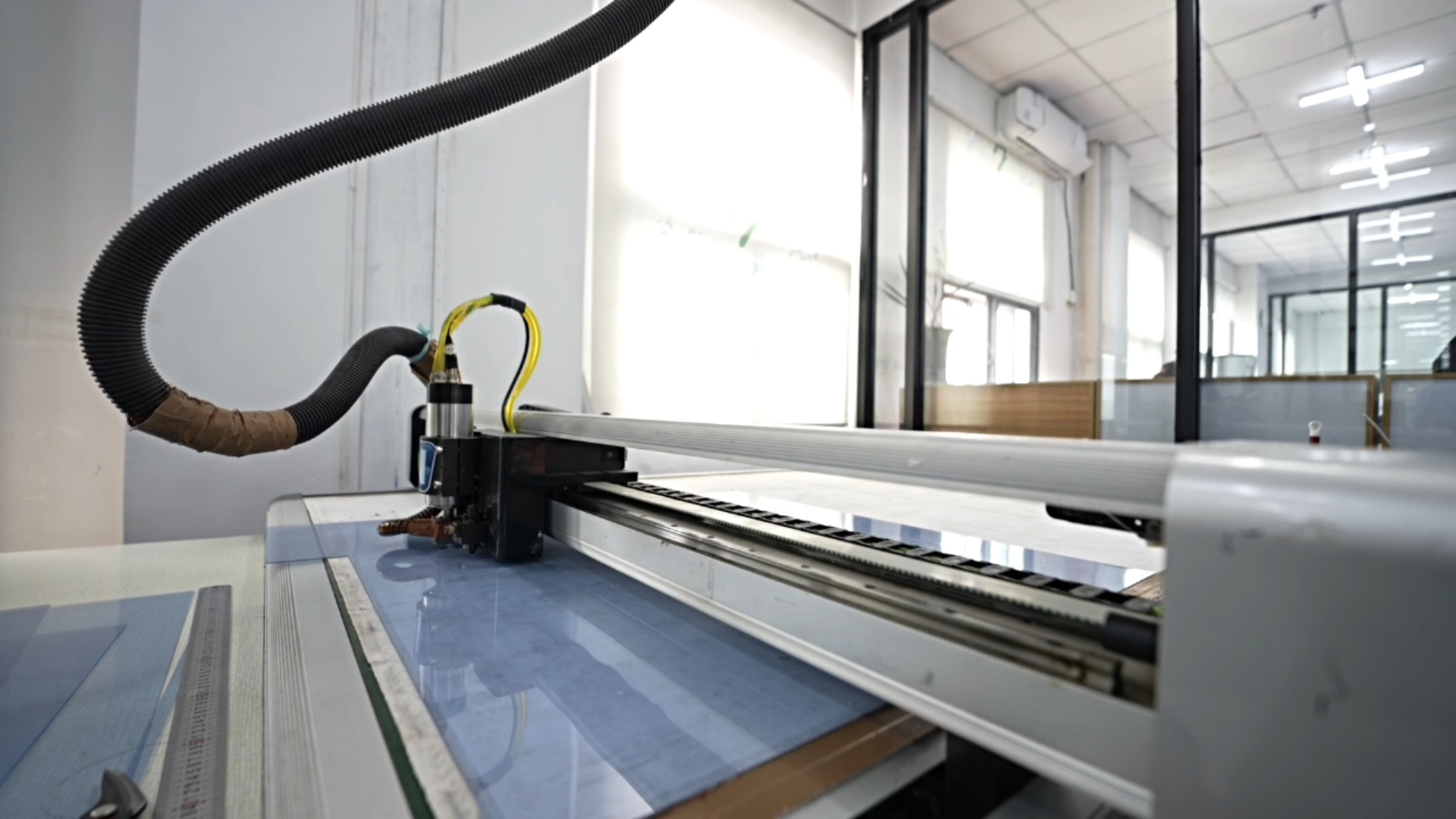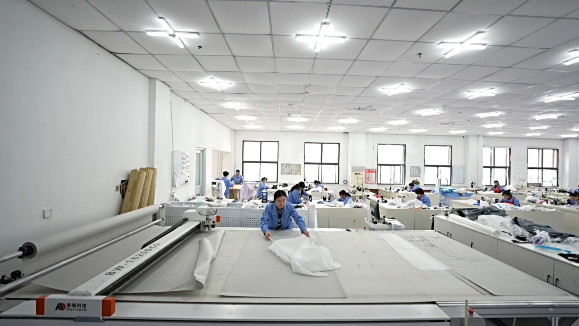 “近几年,我们持续投入上千万,将两个自有工厂产线全部升级为智能吊挂生产车间,引进了自动裁床、高周波、压胶机等设备,生产效率提升了20%左右。”
