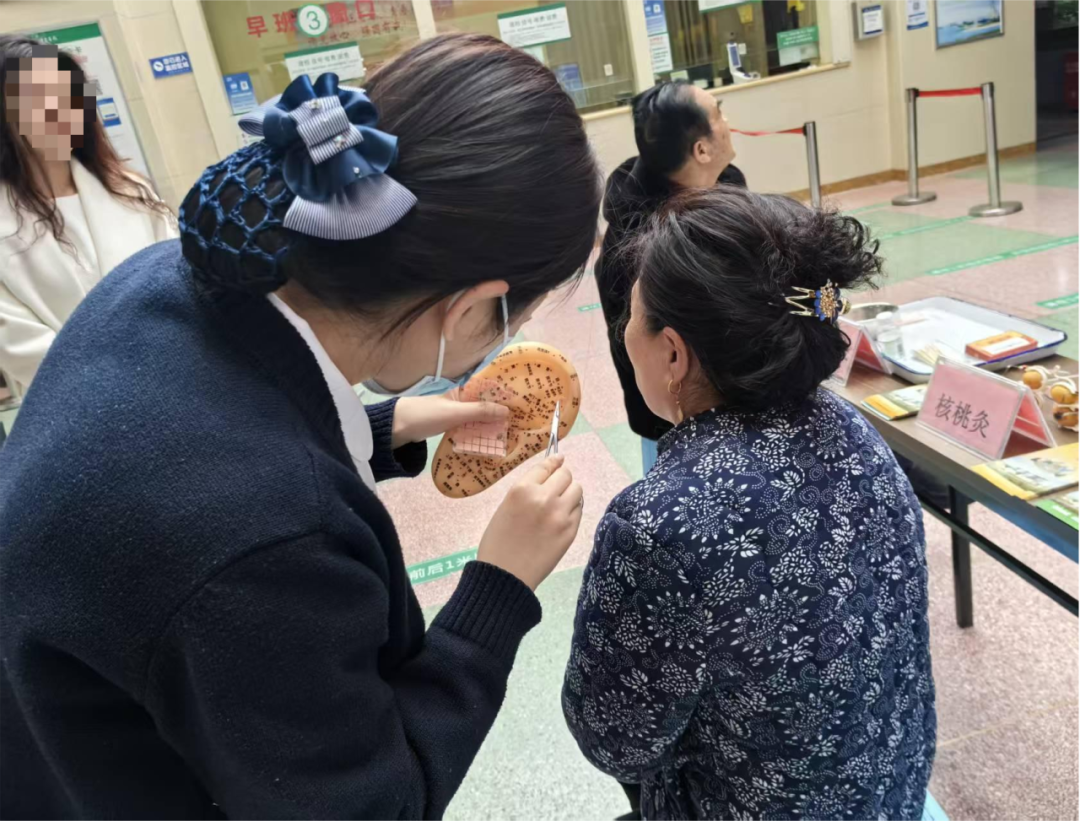 义诊活动重点突出中医药特色,为群众提供免费的核桃灸、耳灸和耳穴压豆等中医护耳体验服务,让群众直观感受中医药在耳部健康养护中的独特优势。护理人员精准选取耳门、听宫、听会、翳风等穴位进行穴位压豆,通过刺激耳廓穴位,调节脏腑功能、改善耳部气血循环,辅助缓解耳鸣、失眠等不适,同时手把手教群众识别穴位、掌握简单的耳穴按压方法,方便群众日常居家养护。此外,免费发放“中医保健茶”“食疗养生防病法”等中医药护耳健康宣教资料,图文并茂地展示护耳知识和中医药特色护耳方法,方便群众后续学习参考。