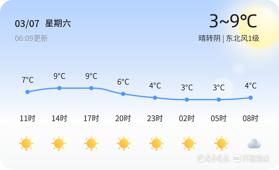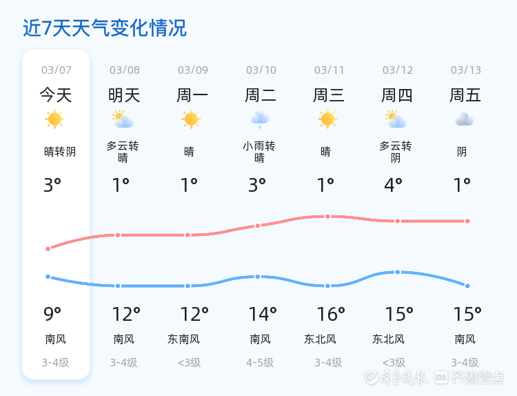 今天是3月7日,星期六,农历正月十九,德州迎来晴转阴的天气,东北风1级,湿度较高,空气质量良好。各区天气总体稳定,市民出行需注意保暖和防晒。 明天,德州天气将转为多云转晴,气温较今日有所上升,最低气温1℃,最高气温12℃,南风3-4级。市民可适当减少衣物,享受春日暖阳。 未来三天,德州天气将呈现逐步回暖趋势,3月9日晴,气温1℃至12℃;3月10日小雨转晴,气温3℃至14℃,南风4-5级,提醒市民注意防风保暖,雨天出行请注意交通安全。 温馨提示