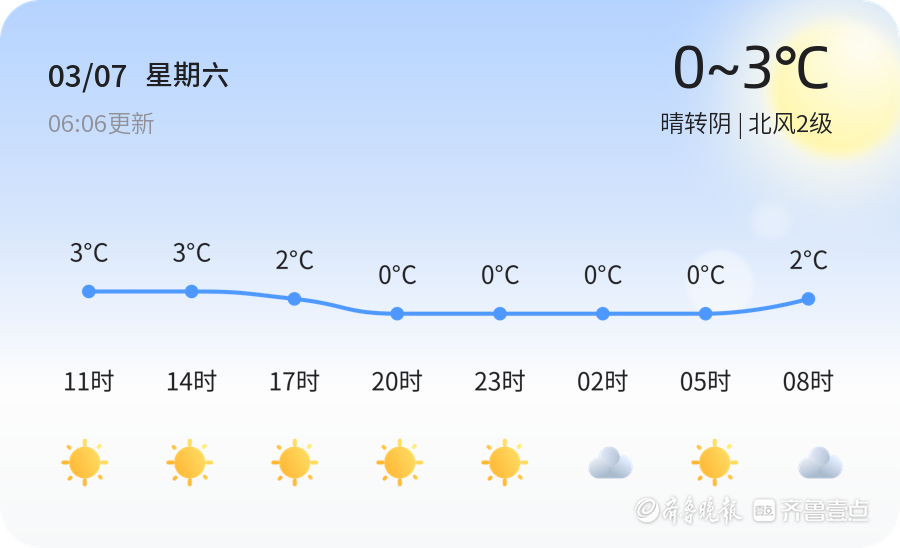 今天是2026年3月7日,星期六,农历正月十九。日照市今日天气晴转阴,气温范围在0℃至3℃之间,北风2级,空气湿度60%,PM2.5浓度为29微克/立方米,空气质量为优。今日天气较为适宜出行,市民可放心进行户外活动。建议市民出行时根据实时天气情况增减衣物,注意保暖。PM2.5浓度较低,空气质量良好,对健康人群无影响,敏感人群亦可正常活动。