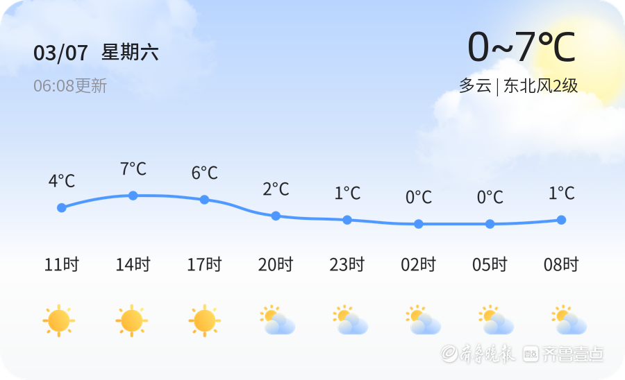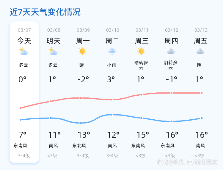 今天是3月7日,星期六,农历正月十九。临沂市今天天气多云,气温介于0℃至7℃之间,东北风2级,空气湿度76%,PM2.5指数82,空气质量良好。全市各区县天气情况总体平稳,多云为主,偶有零星云层覆盖,整体气候舒适宜人。市民们在享受温暖阳光的同时,也请注意适时增减衣物,保持健康体魄。明天天气将有所变化,预计为多云转晴,气温较今日有所上升,最低气温1℃,最高气温11℃,风向转为南风,风力小于3级。与今日相比,明日白天气温略有回升,阳光更加充足,适合户外活动。市民们可以趁着好天气,安排外出计划,享受春日的温暖阳光。未来三天,临沂市天气趋势以晴或多云为主,气温逐渐回升。预计周一(3月9日)天气晴朗,气温范围-2℃至13℃,风力3-4级;周二(3月10日)将有小雨,气温3℃至12℃,风力同样为3-4级;周三(3月11日)转为晴天,气温回升至1℃至15℃,风力小于3级。在此提醒市民,周一和周二的天气变化较大,尤其是周二的小雨天气,市民出行时需携带雨具,注意防寒保暖。温馨提示