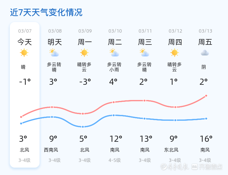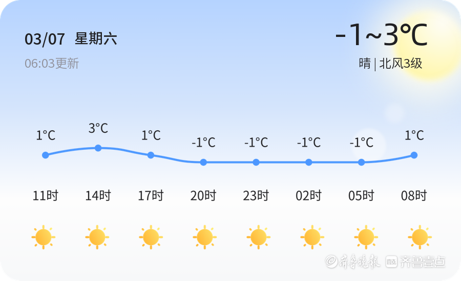 今天是3月7日,星期六,农历正月十九。烟台市迎来晴好天气,气温在-1℃至3℃之间,北风3级,空气湿度49%。各区天气情况基本一致,均为晴朗天气。