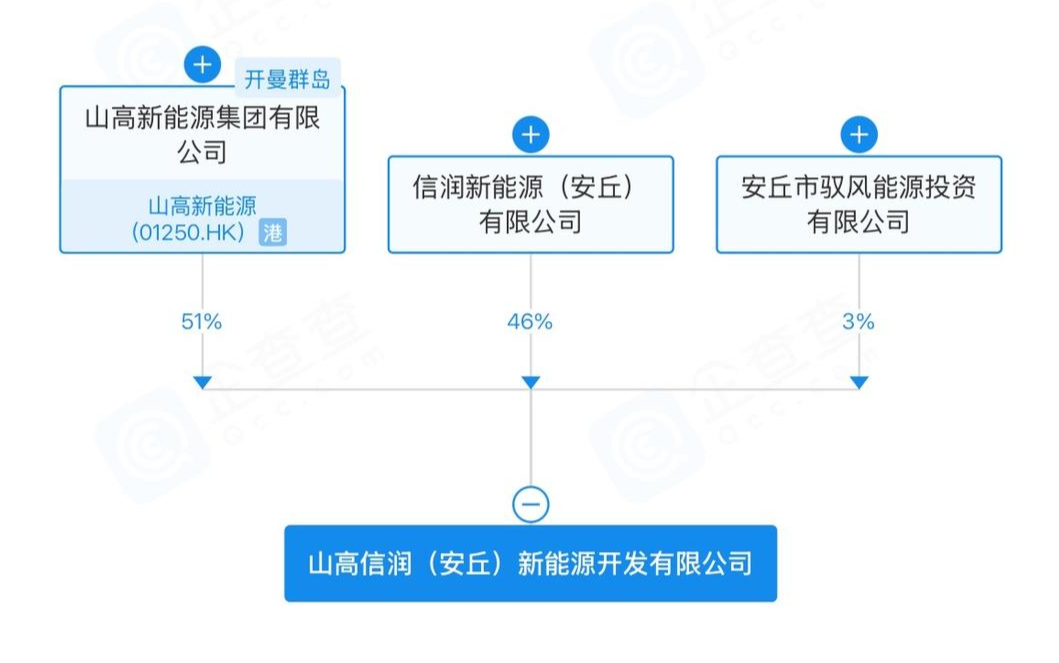 股权穿透显示,山高新能源(01250.HK)、信润新能源(安丘)有限公司、安丘市驭风能源投资有限公司分别持有山高信润(安丘)新能源开发有限公司51%、46%、3%的股权。其中,安丘市驭风能源投资有限公司为安丘国企——安丘市青春柘山城乡建设发展有限公司控股子公司,去年5月8日成立,注册资本15万元,法定代表人郭世学,实际控制人为安丘市柘山镇农业农村综合服务中心。