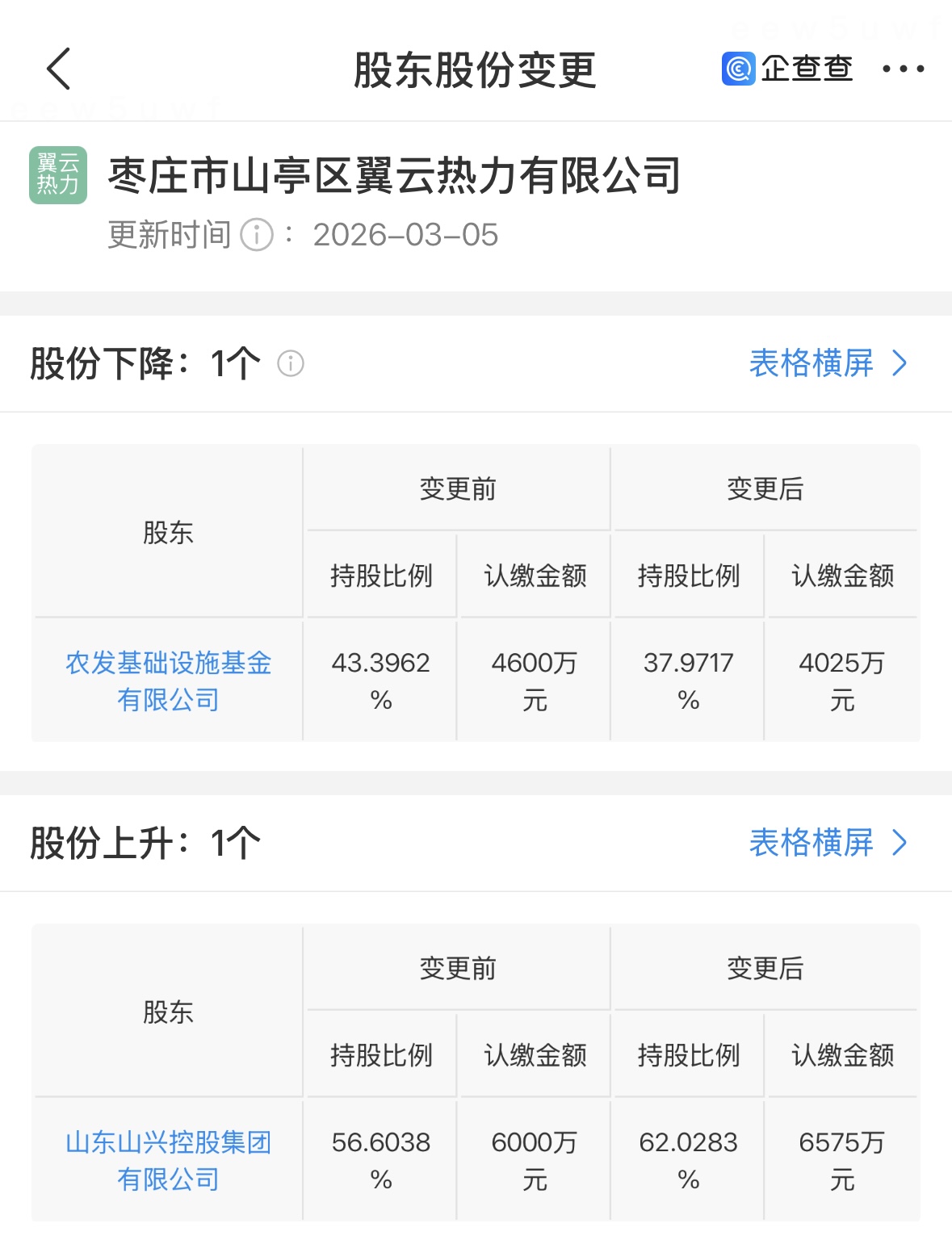 3月5日,枣庄市山亭区翼云热力有限公司股东股份变更:农发基础设施基金持股比例由43.40%变为37.98%,枣庄市属国企——山东山兴控股集团有限公司持股比例由56.60%变为62.02%。