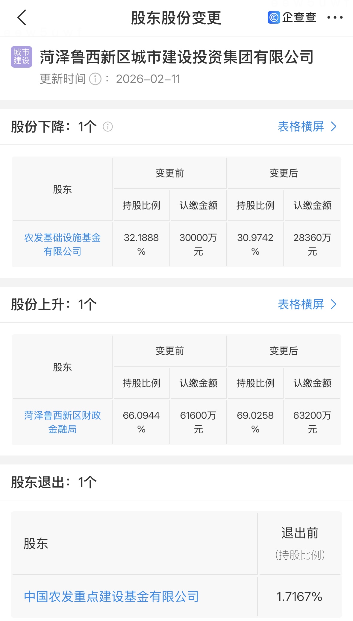 2月11日,菏泽鲁西新区城市建设投资集团有限公司进行了股权调整:农发基础设施基金持股比例由32.19%变为30.97%;菏泽鲁西新区财政金融局持股比例由66.09%变为69.03%,此外股东方之一——中国农发重点建设基金有限公司退出,退出前持股比例为1.72%。