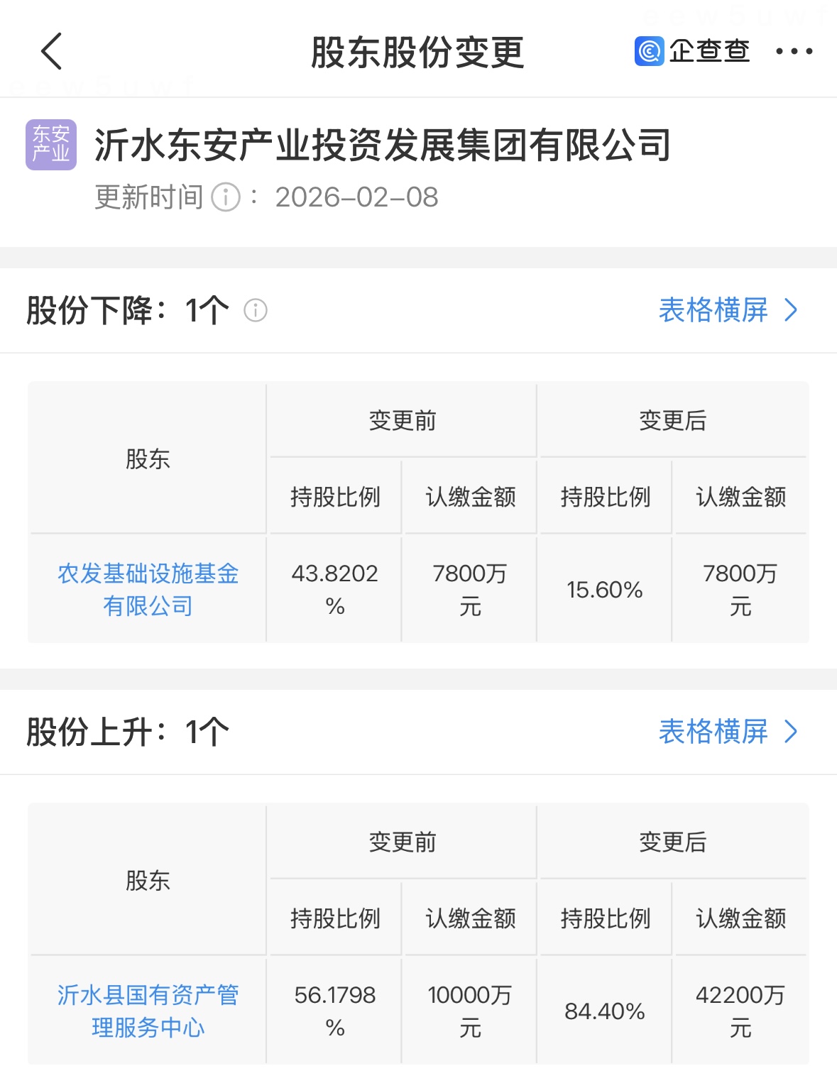 2月8日,沂水东安产业投资发展集团有限公司股权调整:农发基础设施基金持股比例由43.82%变为15.60%,沂水县国有资产管理服务中心持股比例由56.18%变为84.40%。