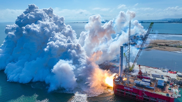 The photo shows a first-stage propulsion system test for the TL-3 liquid carrier rocket conducted on an offshore launch pad at the Haiyang Oriental Aerospace Port in East China's Shandong province. [Photo/The New Times]
