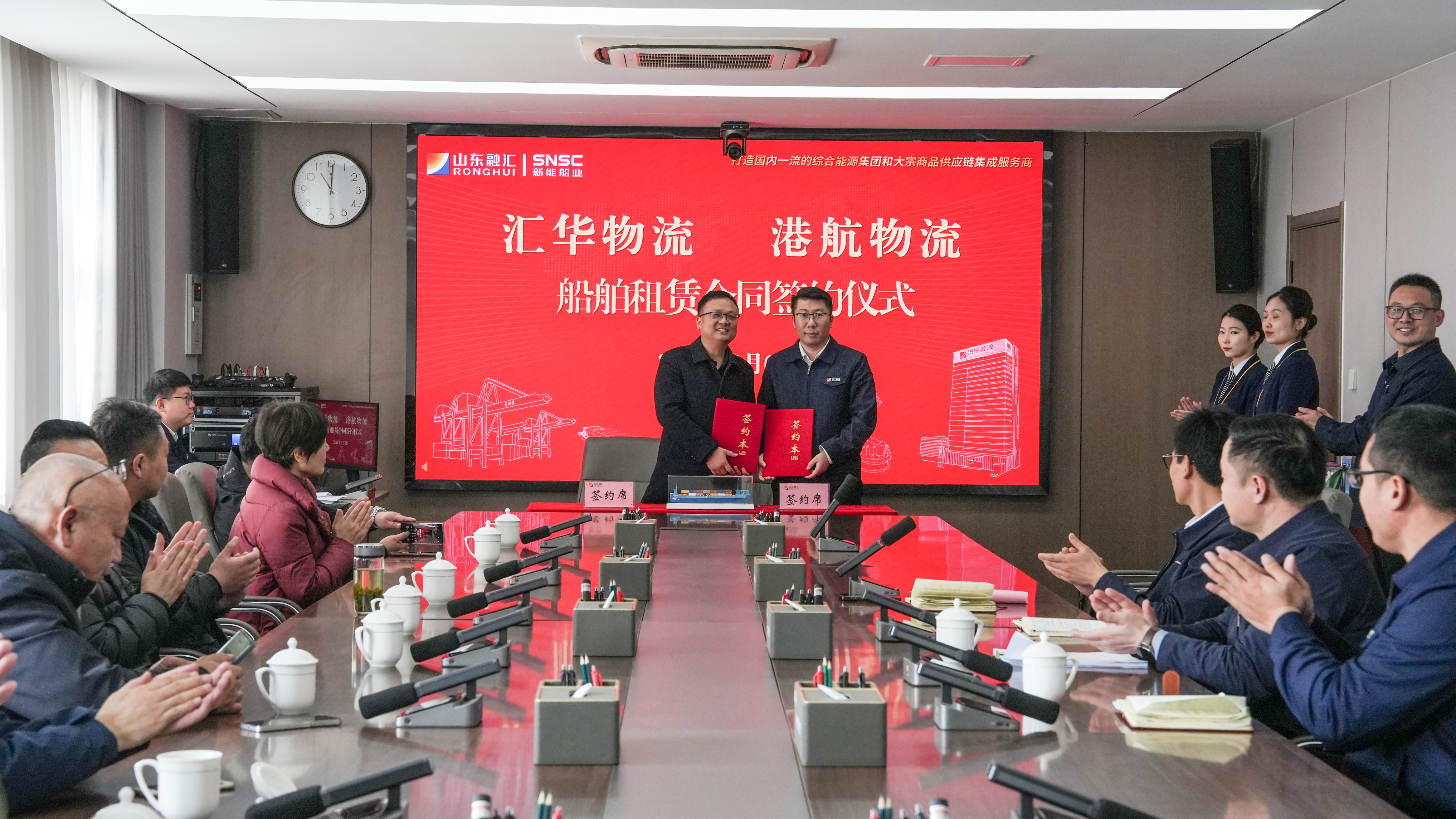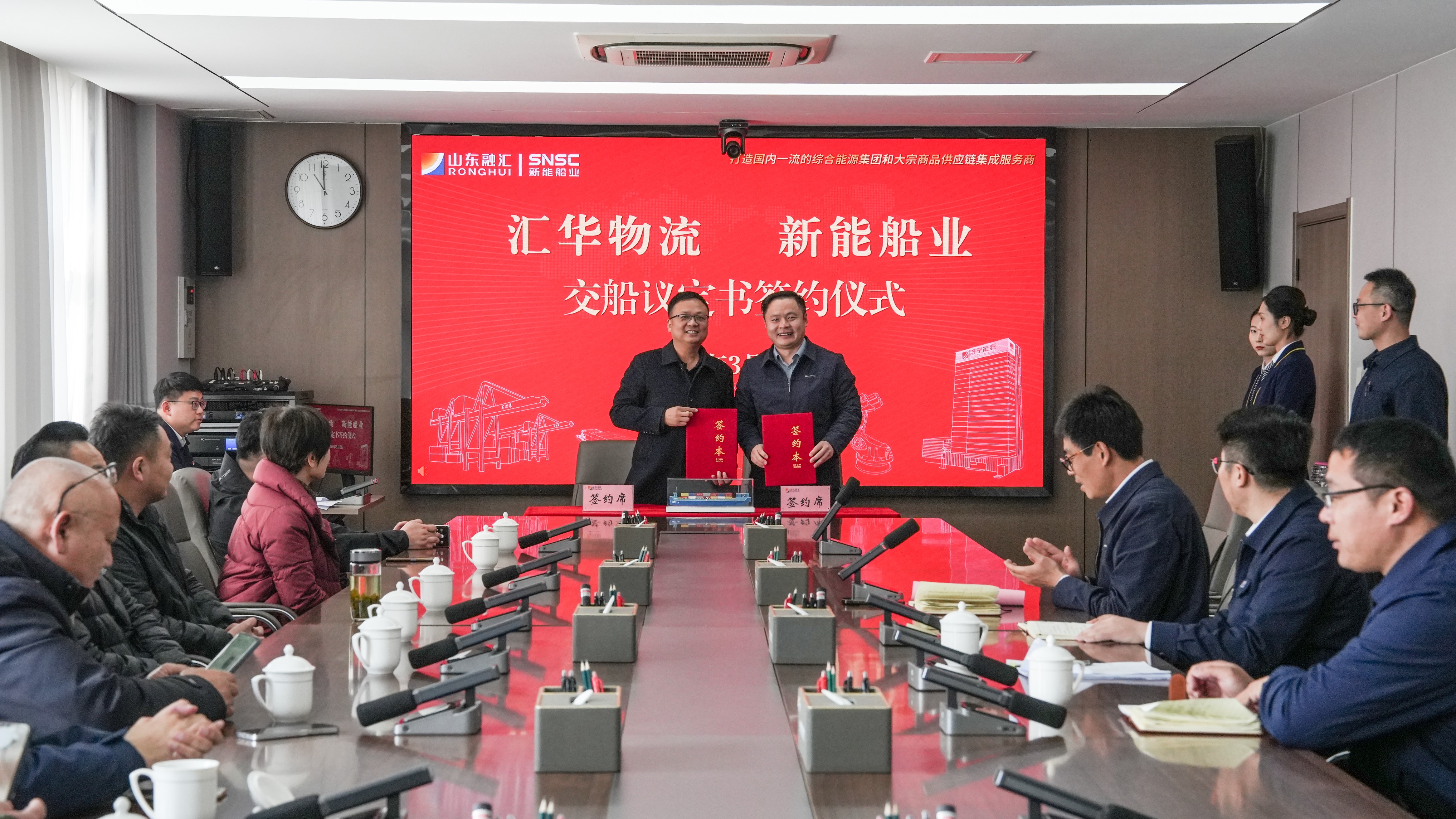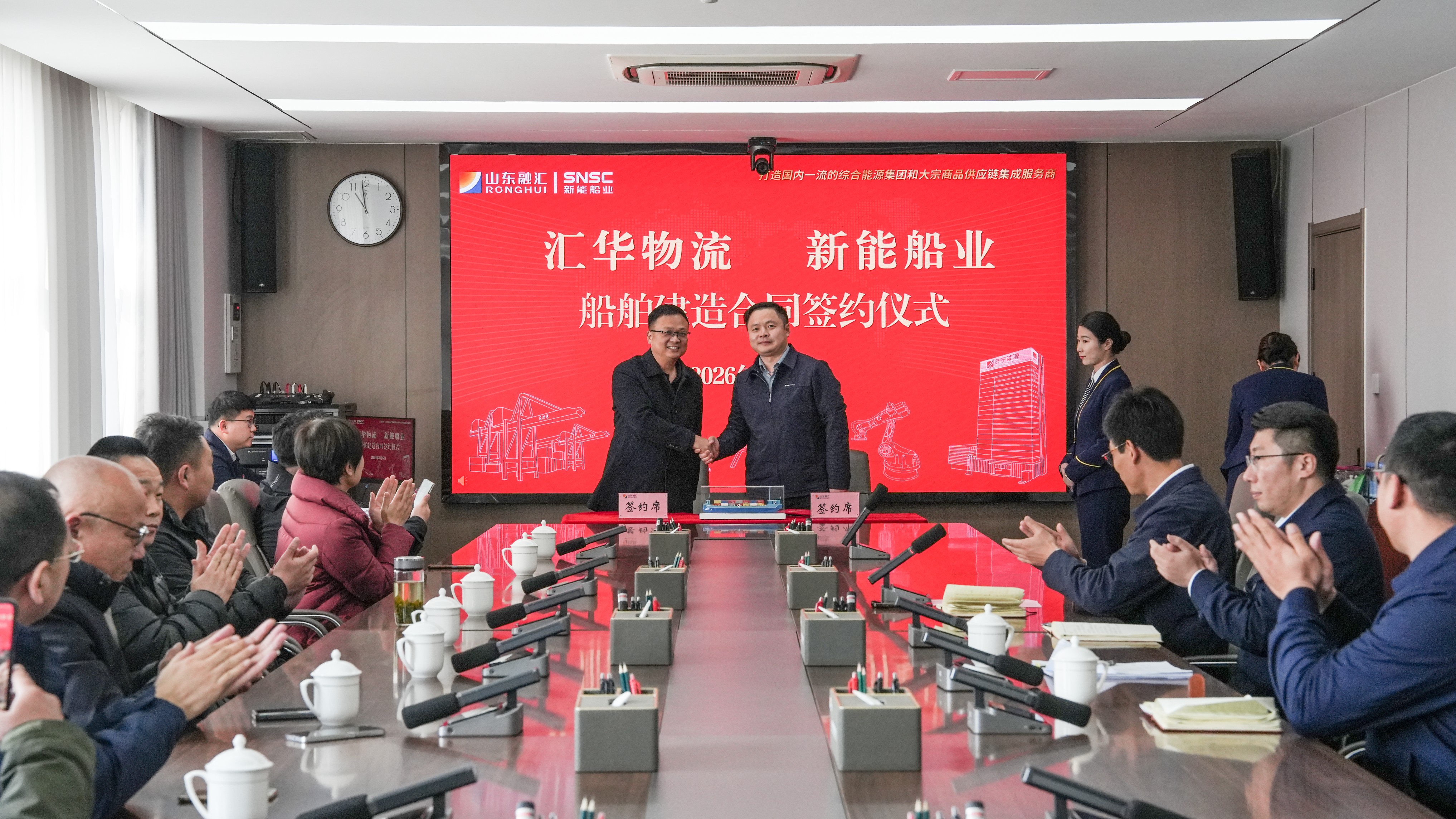 签约环节中,三方一举完成三项合作签约,形成了从新船订单锁定、建成船舶正式交付到后续运营合作落地的全链条业务闭环。其中,新能船业与山东汇华物流先后签订73米新能源船舶建造合同、9005和9006号LNG动力集装箱运输船交船议定书,既敲定了新一轮船舶建造合作、锁定了新增市场订单,也正式完成两艘船舶的建造履约与正式交付;同步完成的山东汇华物流与济宁港航物流船舶租赁协议签约,则全面落实了两艘新船投运后的运营合作安排,实现了船舶建造、交付、运营的全流程无缝衔接。