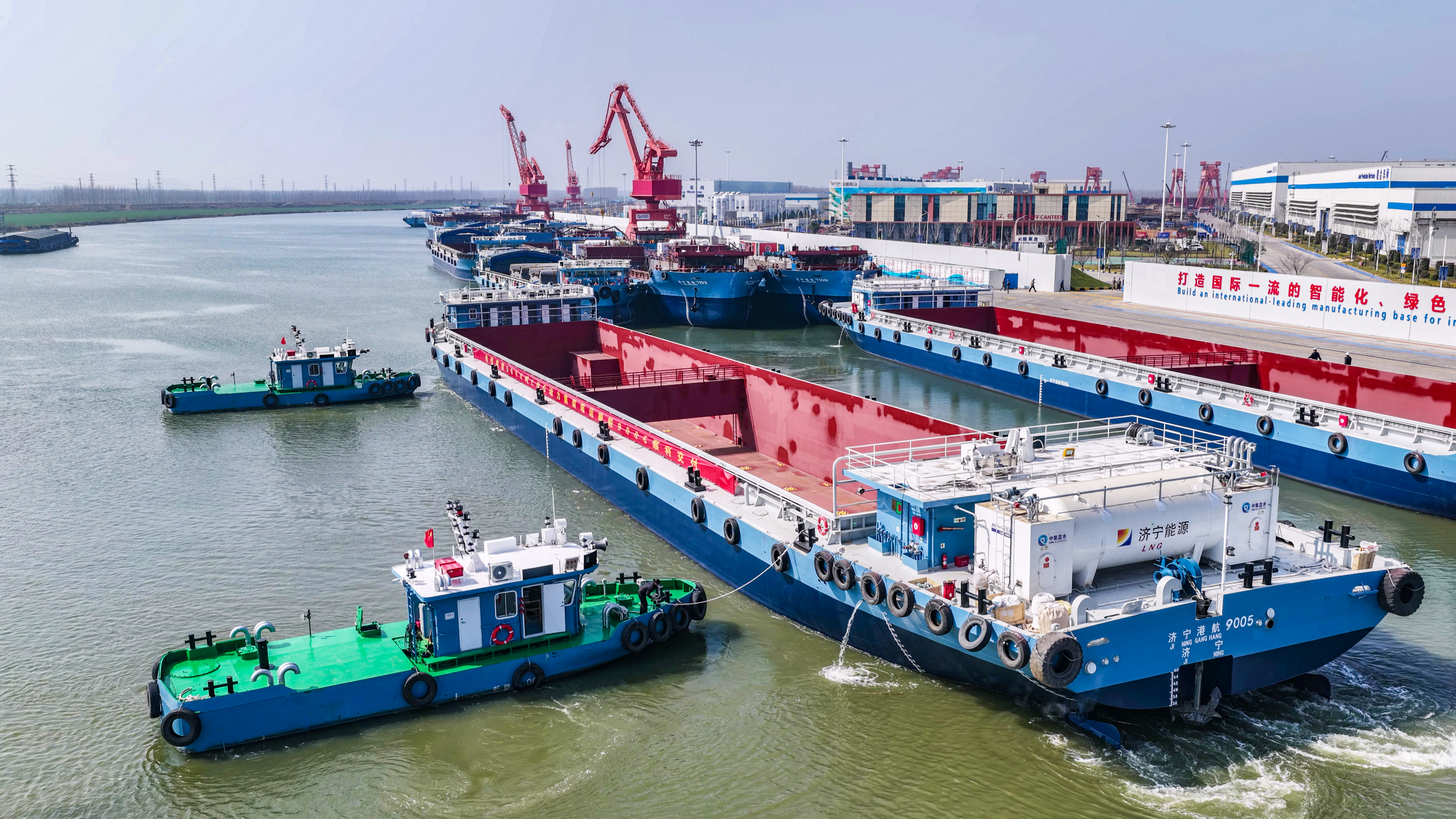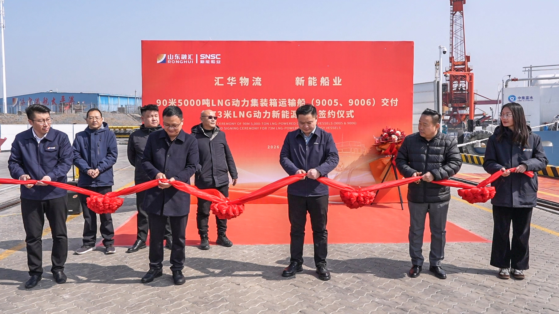 3月6日,73米新能源船舶签约暨9005、9006号LNG动力集装箱运输船交付仪式在新能船业成功举办。山东汇华物流供应链管理有限公司总经理郝登顺,新能船业党委副书记、总经理吴则成,济宁港航物流有限公司副总经理王廷,济宁祥龙船员服务有限公司总经理刘培龙参加活动。