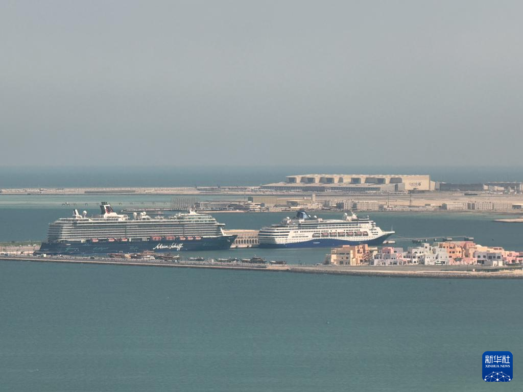 3月6日在卡塔尔首都多哈的港口拍摄的滞留的“迈希夫五号”邮轮(左)。
