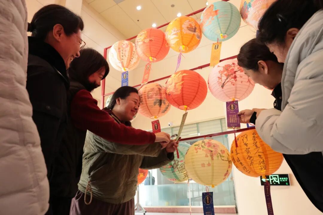 活动现场张灯结彩、暖意融融。一盏盏灯笼鲜艳夺目,一条条谜笺随风轻舞,充满了浓厚的节日气息。本次活动精心设计的谜题,涵盖传统文化、生活常识等多个方面,内容丰富多元,融知识性和趣味性于一体,引得大家纷纷驻足、凝神思索。