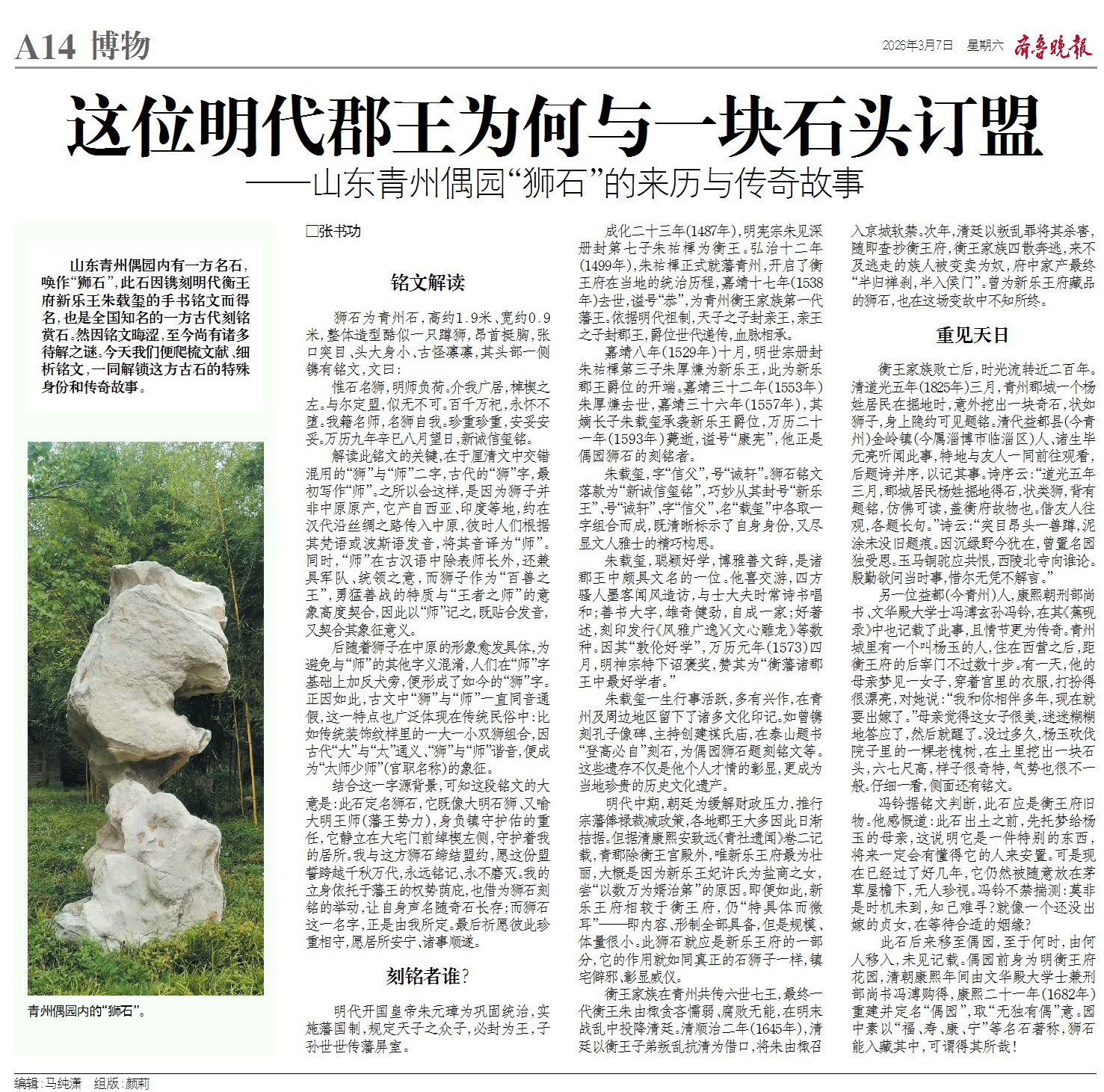 山东青州偶园内有一方名石,唤作“狮石”,此石因镌刻明代衡王府新乐王朱载玺的手书铭文而得名,也是全国知名的一方古代刻铭赏石。然因铭文晦涩,至今尚有诸多待解之谜。今天我们便爬梳文献、细析铭文,一同解锁这方古石的特殊身份和传奇故事。