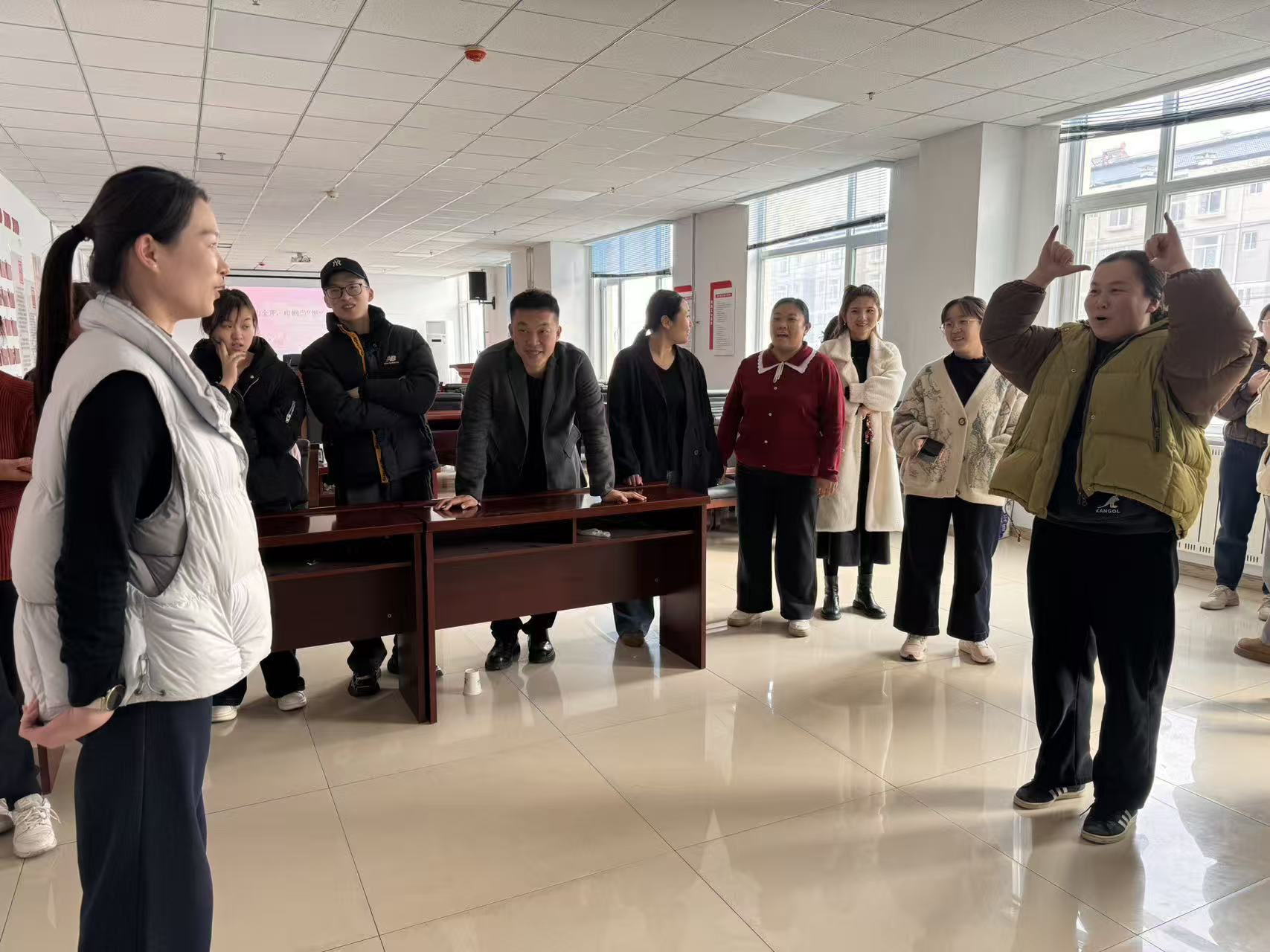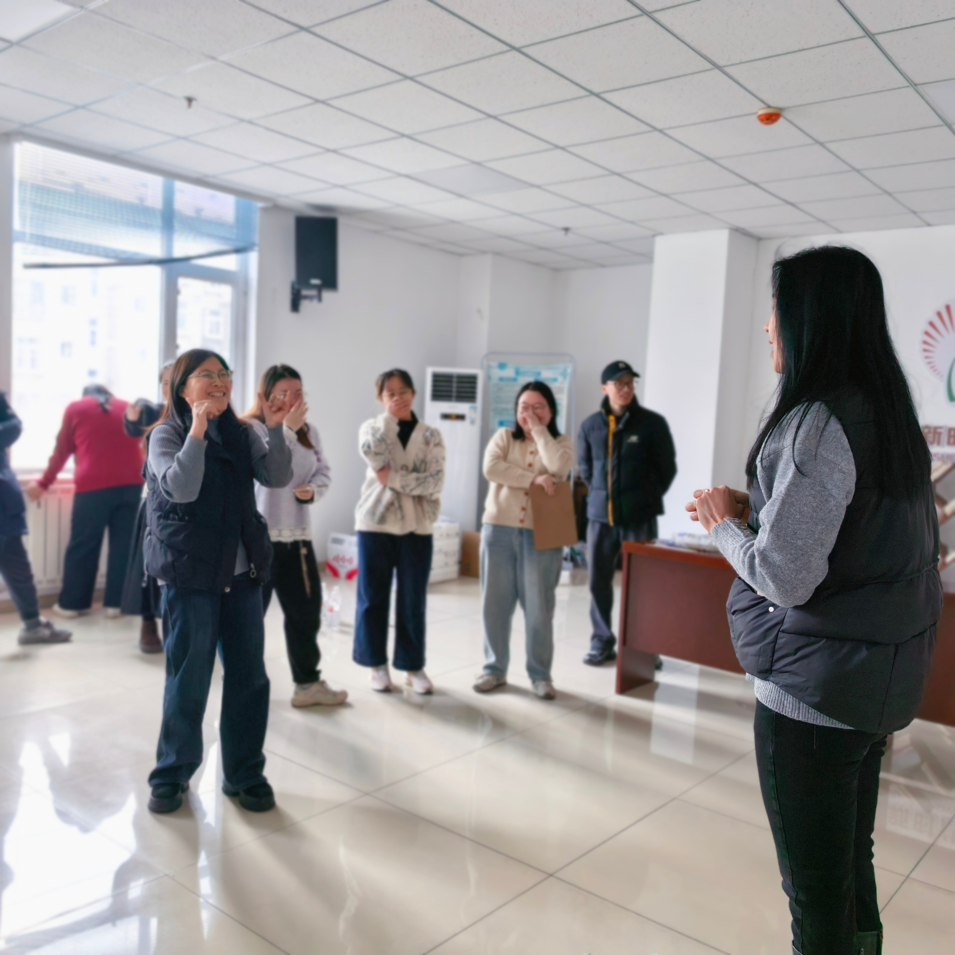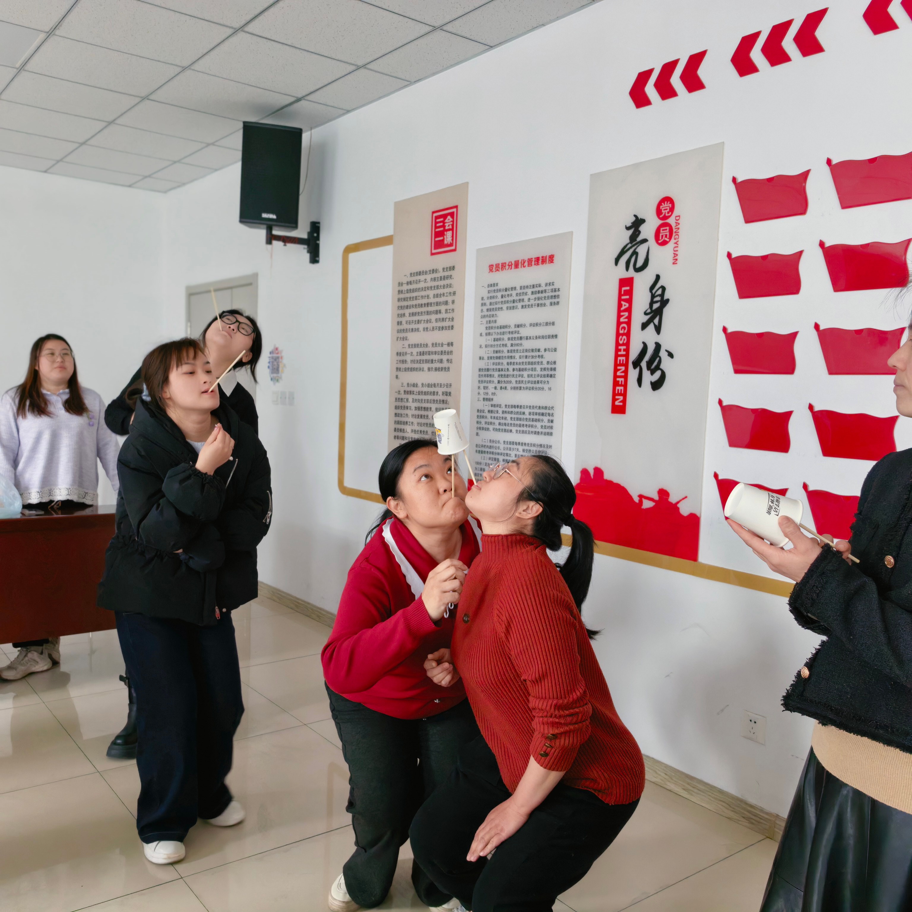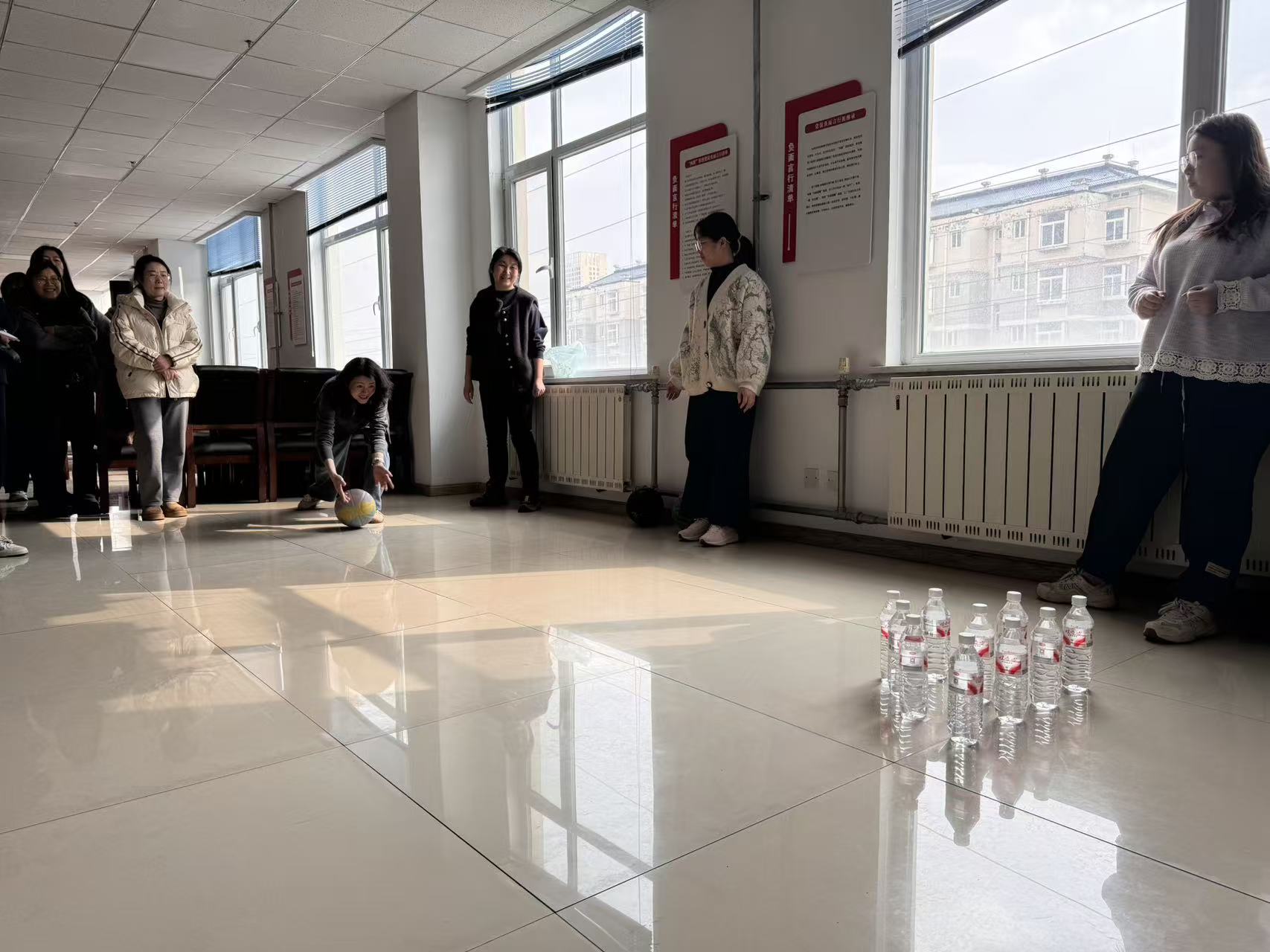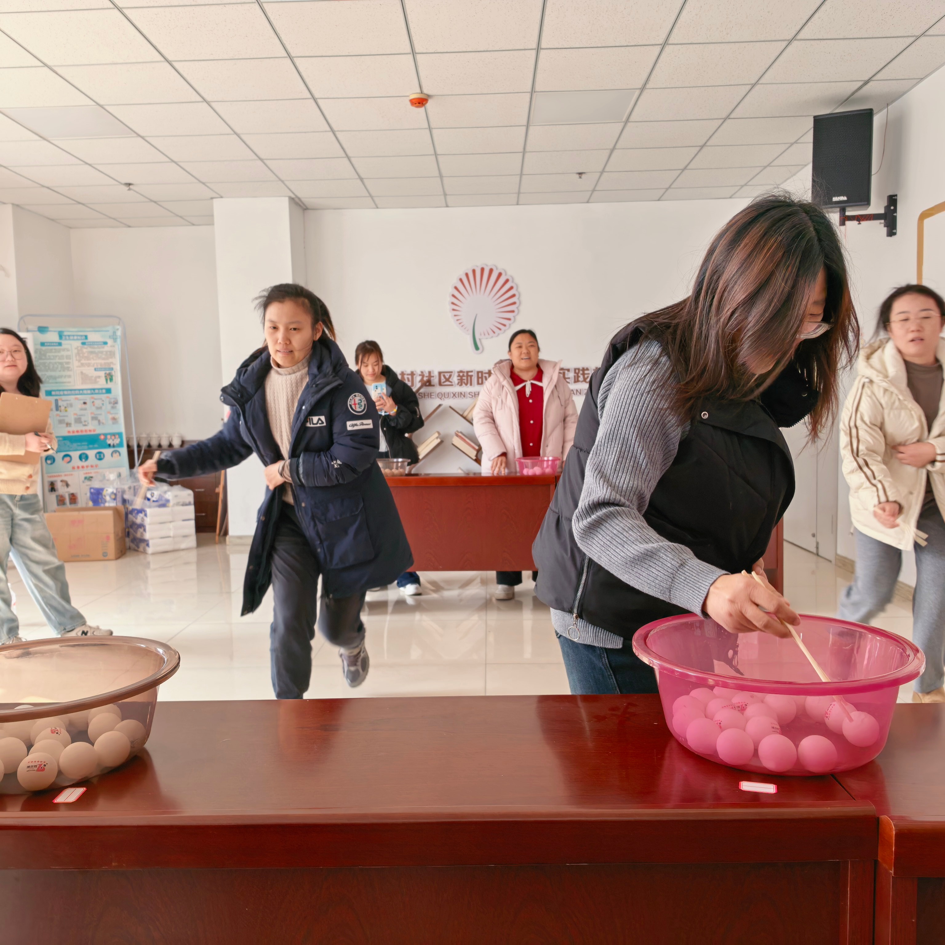 活动开始,首先开场的是“趣味保龄球”,参赛者滚动手中的篮球,水瓶应声倒下,现场喝彩不断。紧接着“筷子夹乒乓球”,选手们屏息凝神,用筷子小心翼翼夹起球快速跑向终点,场面引得观众时而紧张时而哈哈大笑。随后的“你比划我猜”笑料百出,两人一组轮番上阵,比划者手舞足蹈,猜词者绞尽脑汁。“筷子传纸杯”队员们用嘴咬住筷子依次传递纸杯,小小的纸杯传递着姐妹间的信任与默契。在“谁是卧底”环节,姐妹们化身“戏精”展开无声较量,有人成功“潜伏”,有人遗憾出局,推理氛围浓厚。最后的“滚瓶子”环节,大家依次滚动水瓶,随着瓶子缓缓停止,一份份精美奖品被幸运儿收入囊中,掌声欢呼声此起彼伏。