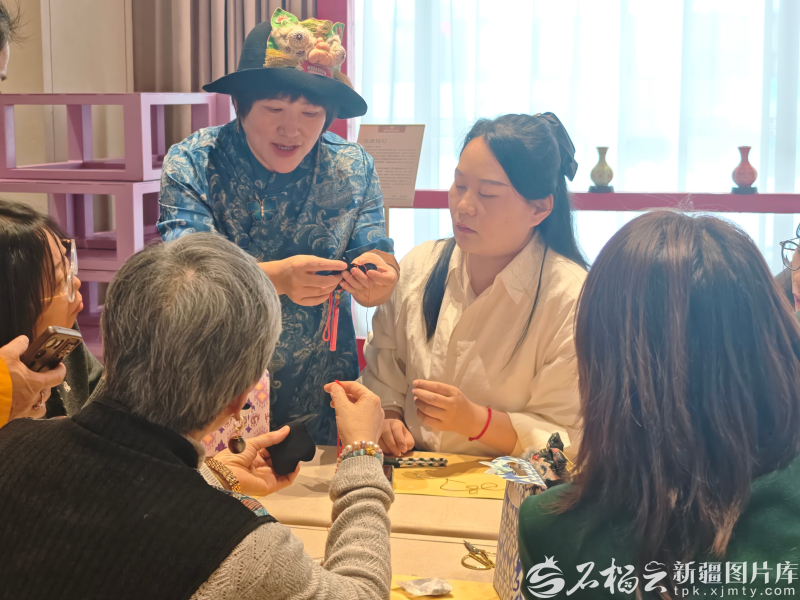 布老虎技艺市级代表性传承人马秀玲向参与布老虎香囊制作的体验者讲解工艺。石榴云/新疆日报记者 宋海波摄
