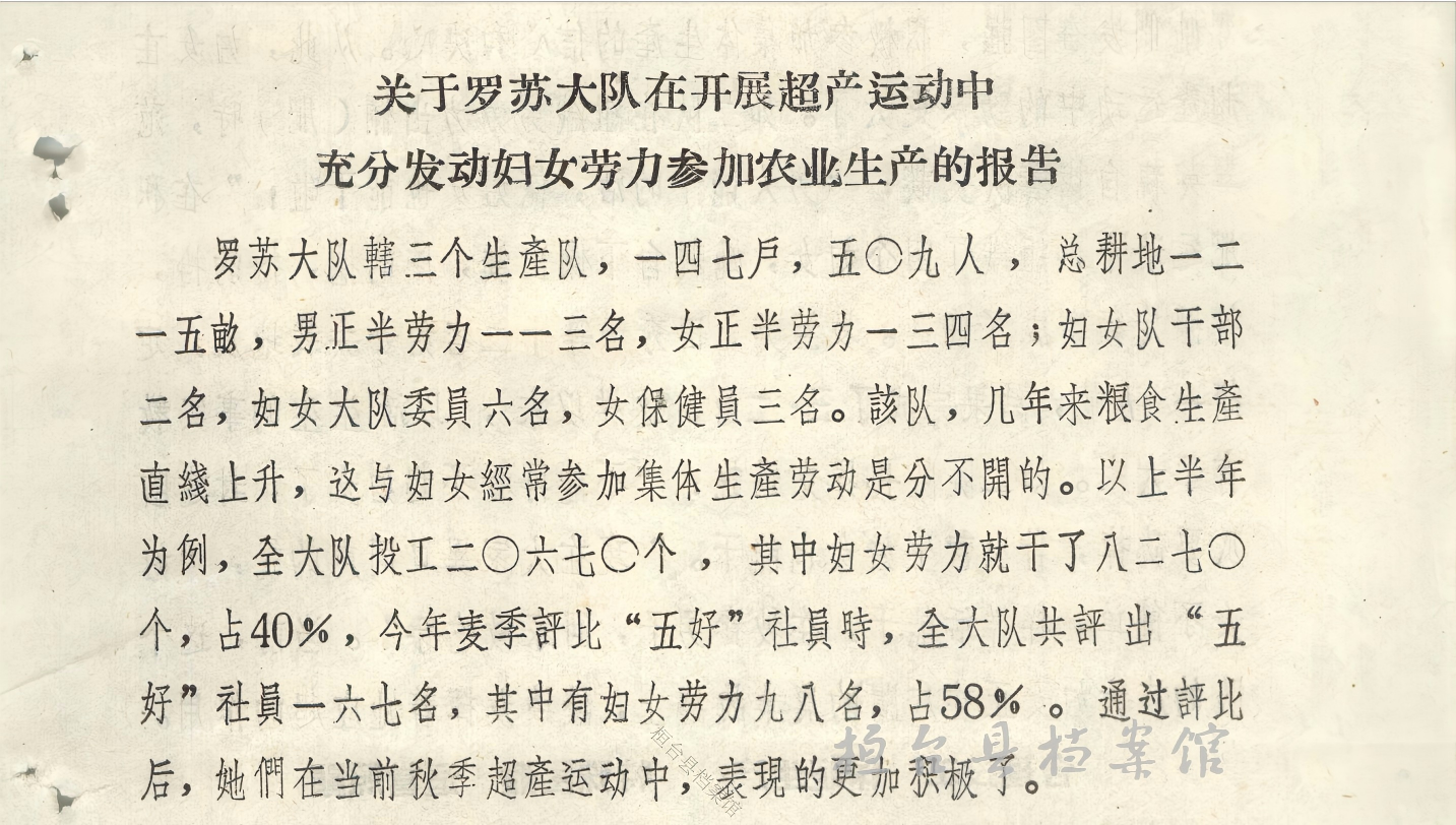 馆藏档案《关于罗苏大队在开展超产运动中充分发动妇女劳力参加农业生产的报告》