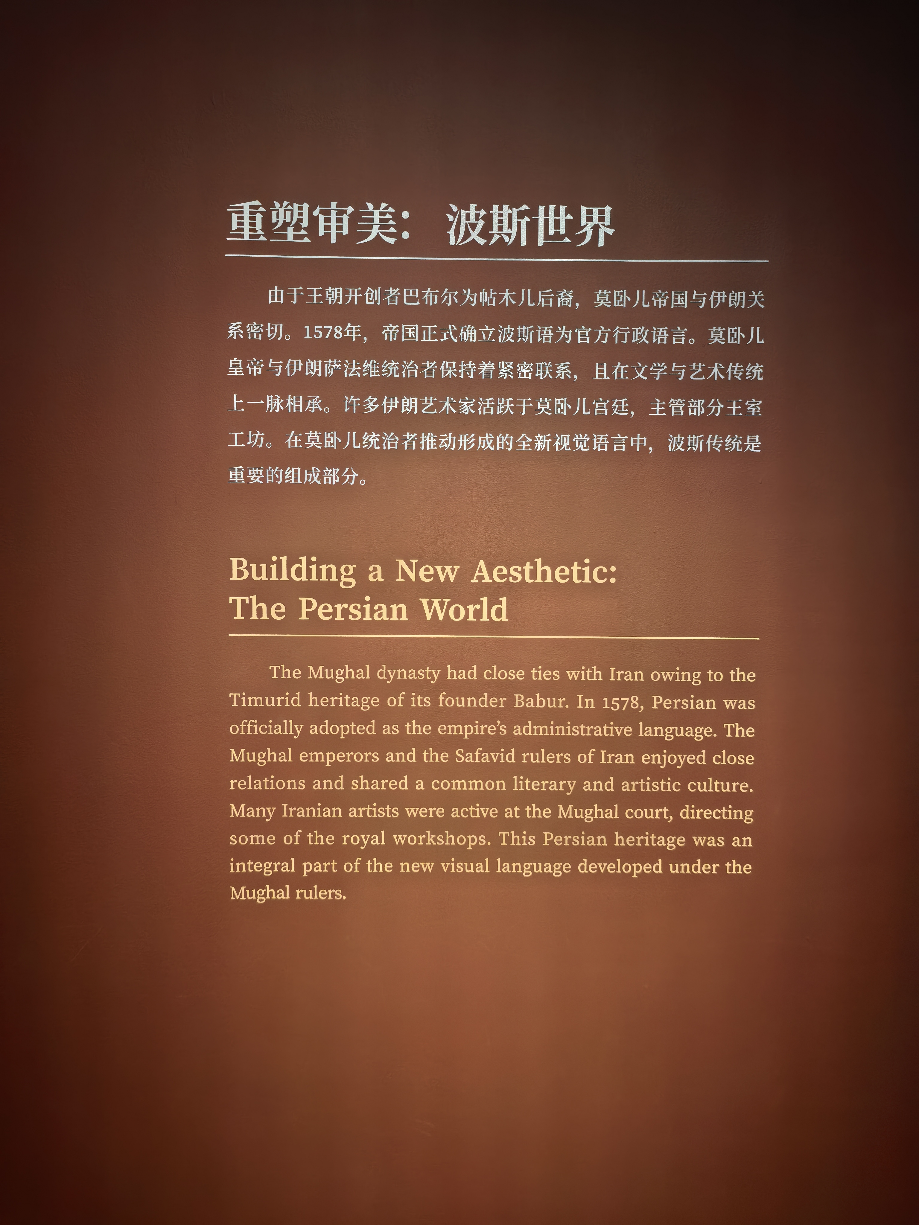 步入展厅,仿佛翻开了一部厚重而华丽的世界美术史。展览时间线贯穿16至19世纪,地理横跨亚、非、欧三大陆;三个板块共计呈现约300件卢浮宫馆藏珍品,涵盖了陶瓷器、珠宝、玉石器物、玻璃制品、金属制品、地毯、书法、绘画、雕塑、木质雕刻物等多个印度、伊朗与奥斯曼世界的艺术品类。
