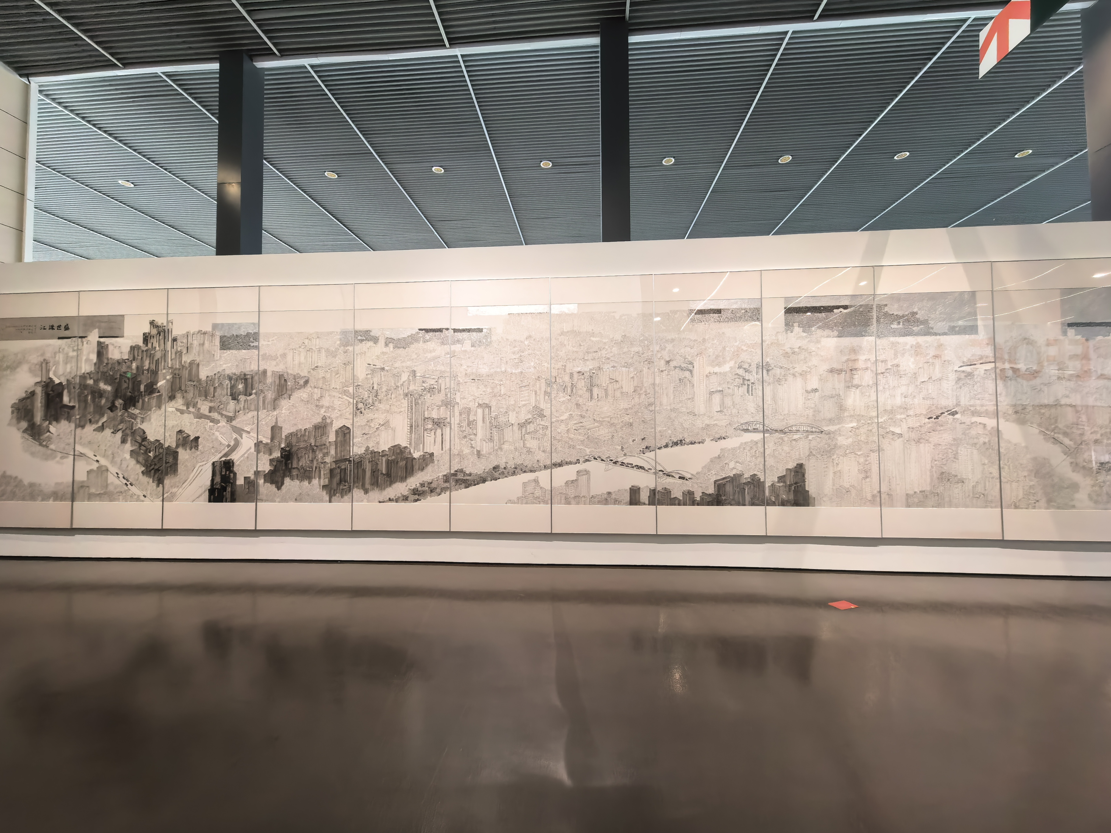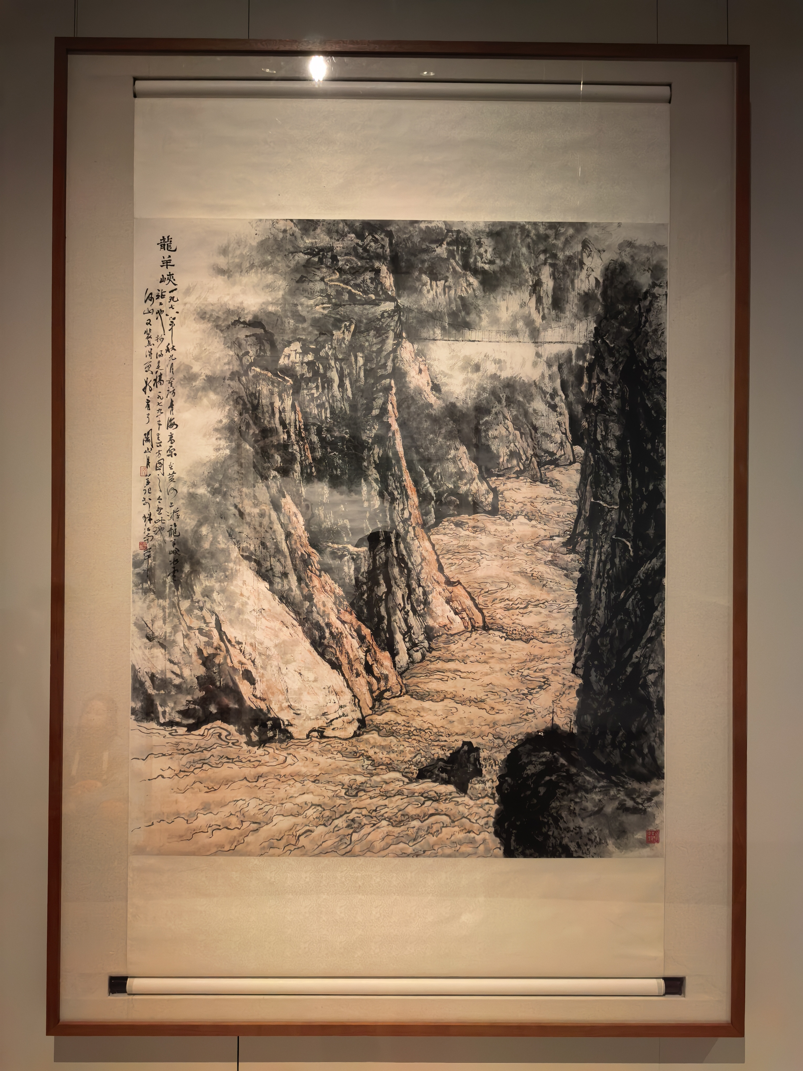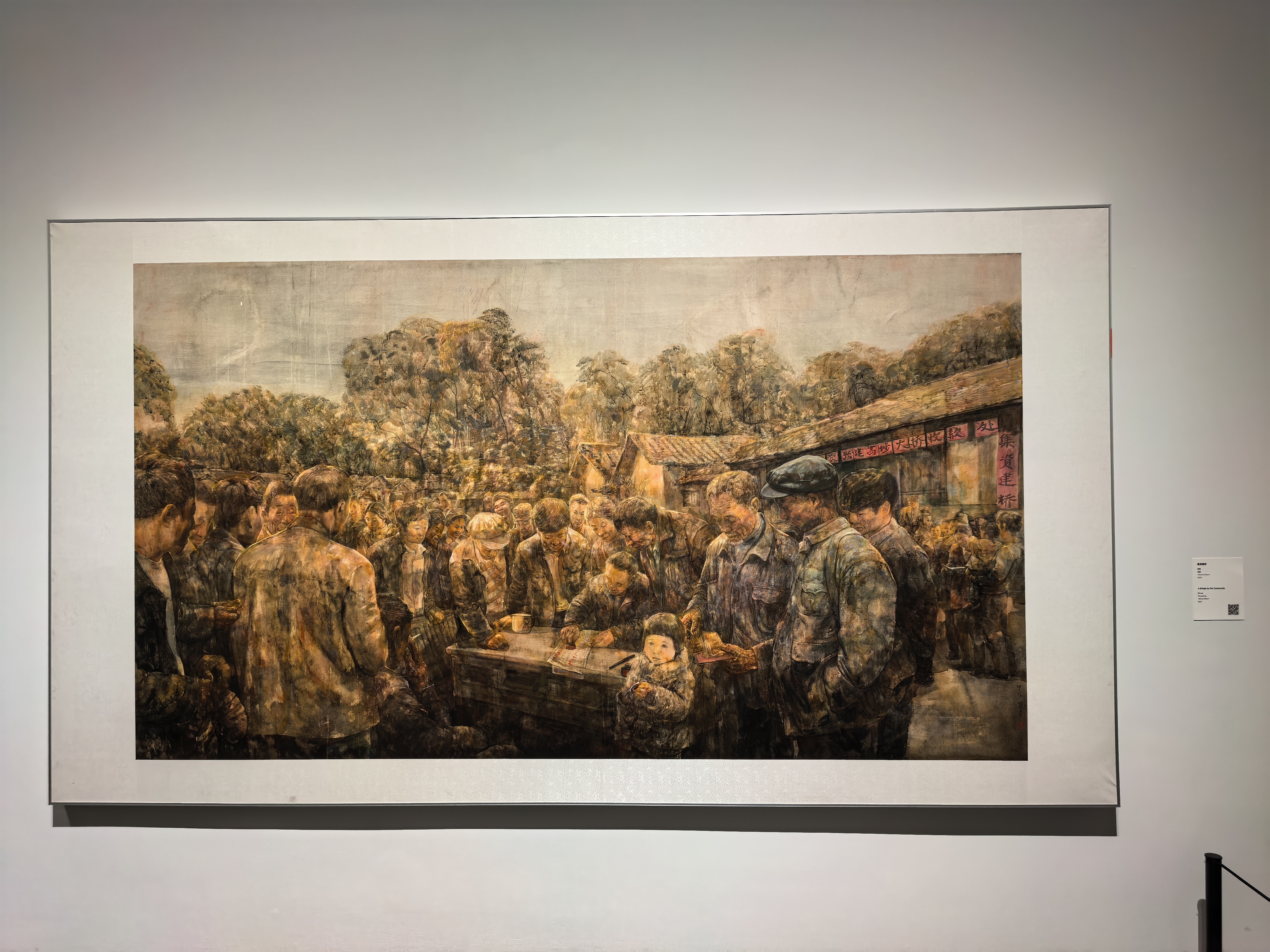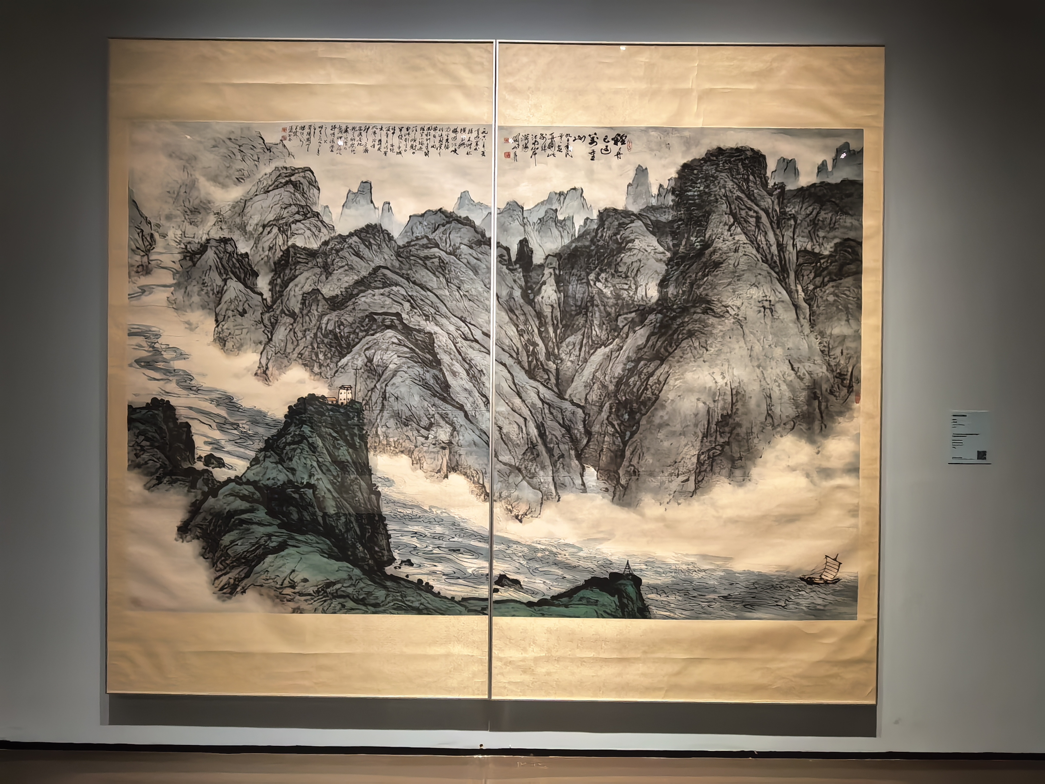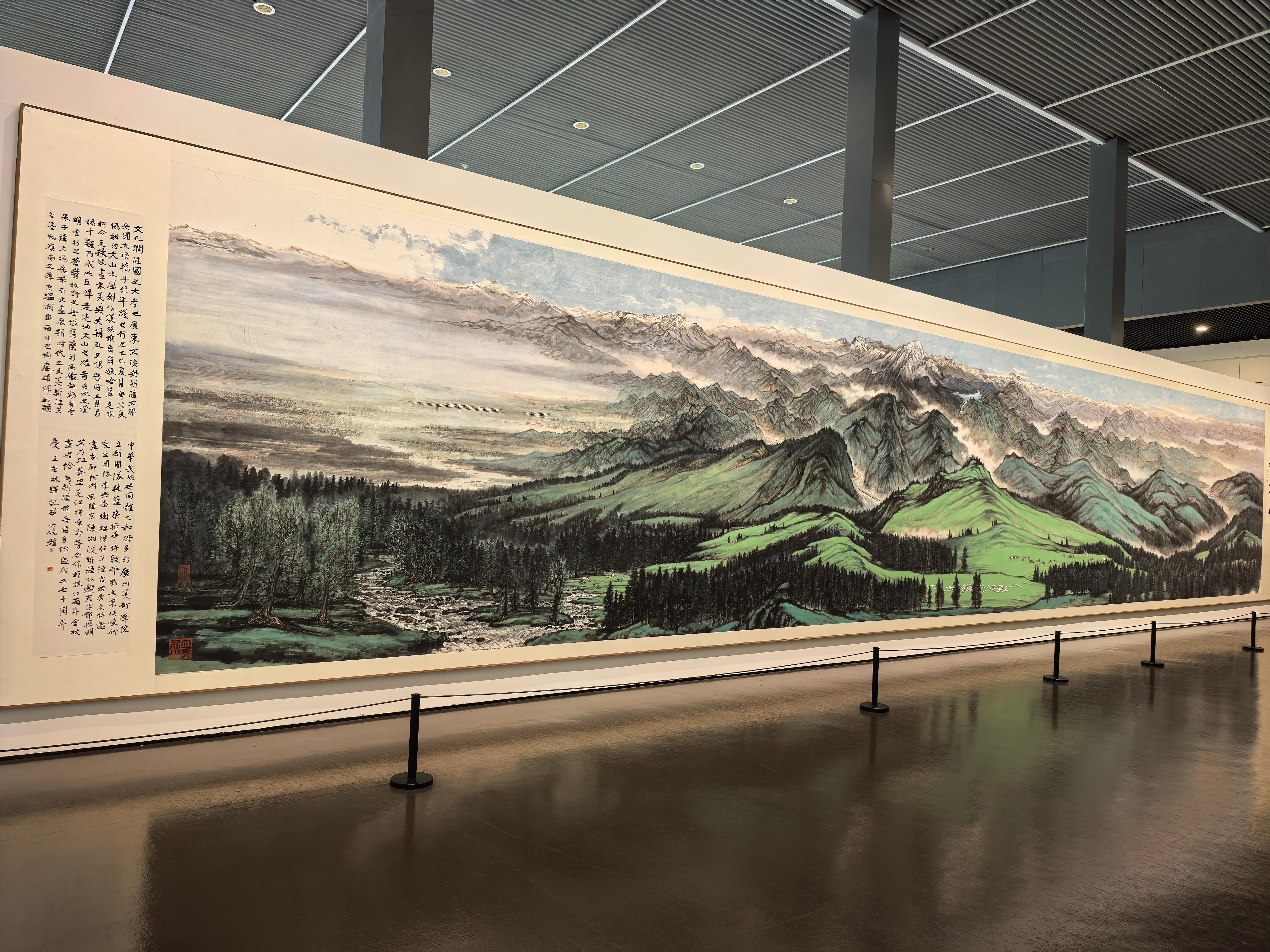 当代创作同样震撼。由林蓝领衔创作的巨幅国画《大美天山》长达16米、高3米,以细腻而磅礴的笔墨描绘新时代边疆的壮美气象,悬挂于主展厅尤显震撼。此外,展览还引入科技手段,特别设置300米“文献时光长廊”,通过AI技术让《饮早茶》等经典作品“动起来”,使观众得以沉浸式体验岭南生活的烟火气息。