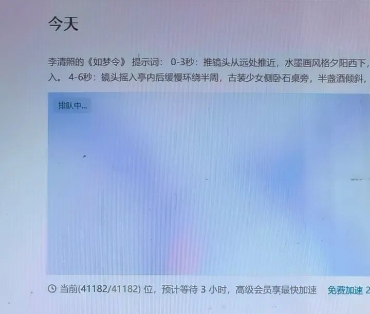 当前真实情况如何?3月7日,极目新闻记者进行了实测,在提交6秒的视频任务后,网页显示排在第4.1万位,预计等待时间为3小时。使用一次免费加速服务后,等待时间缩短至2小时。