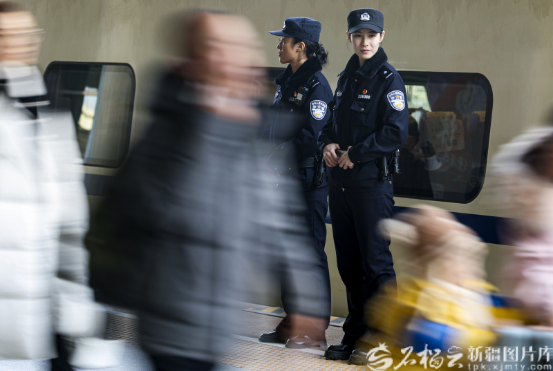 “丝路风华”女子乘警组成员在站台守护旅客上车。乌鲁木齐铁路公安局乌鲁木齐公安处供图