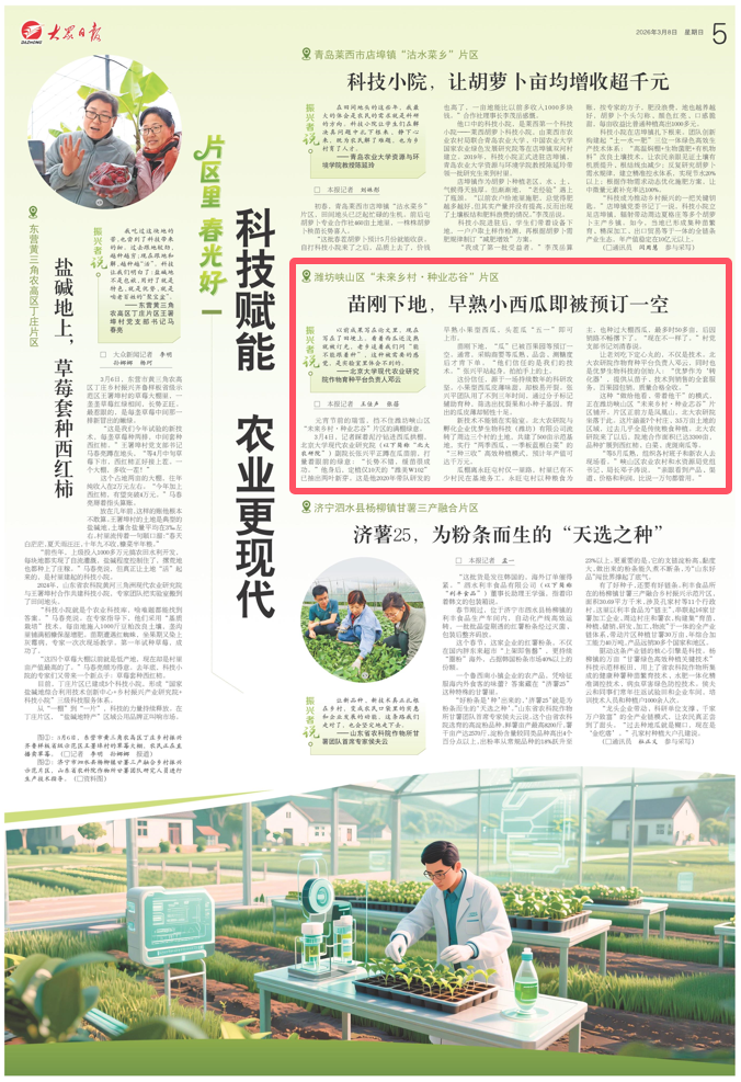 这种“做给他看、带着他干”的模式,正在潍坊峡山区“未来乡村·种业芯谷”片区铺开。片区正前方是凤凰山,北大农研院坐落于此。这片涵盖7个村庄、3.5万亩土地的区域,过去几乎全是传统粮食种植。北大农研院来了以后,院地合作面积已达3300亩,品种扩展到西红柿、白菜、虎斑南瓜等。