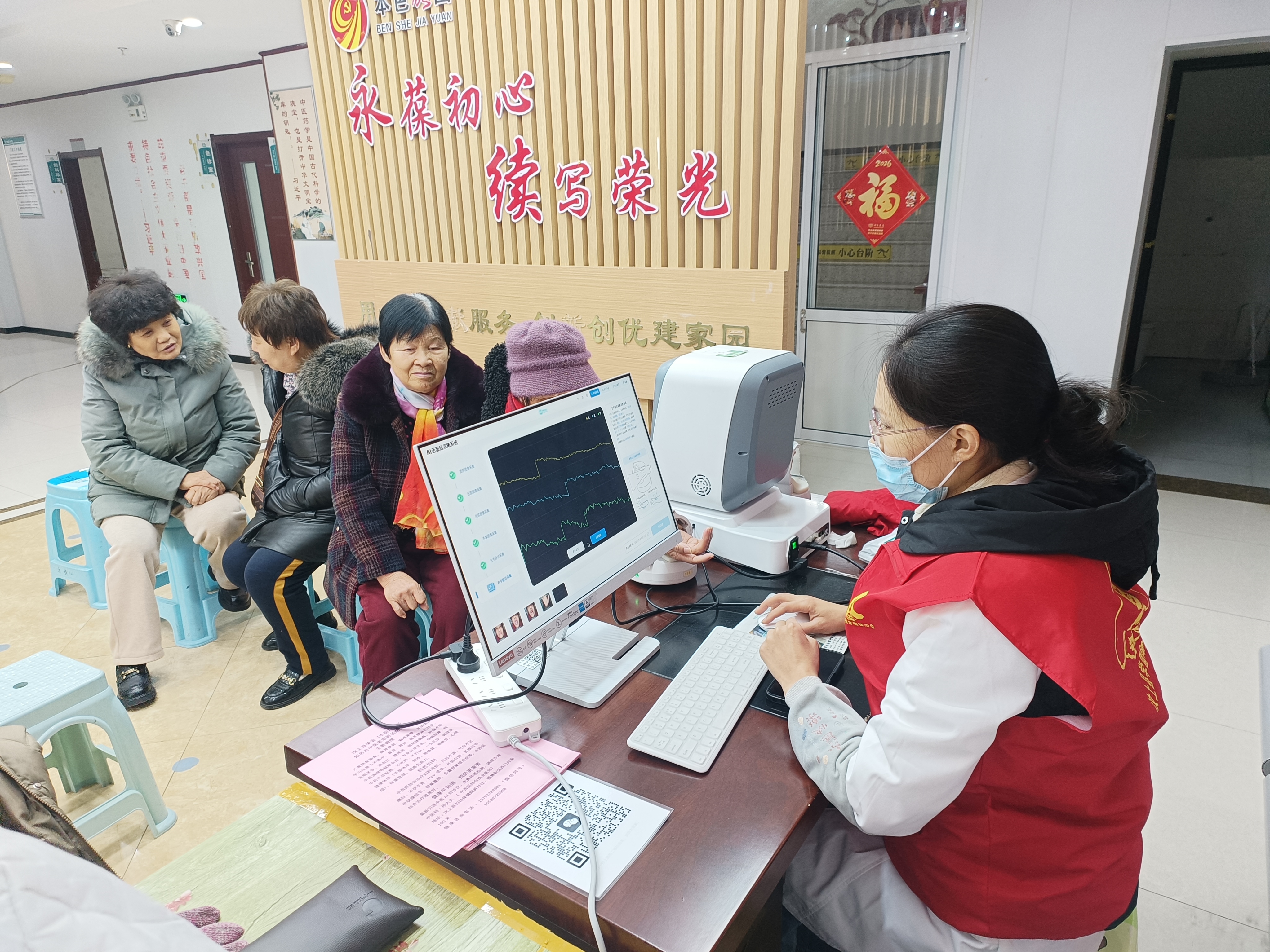 健康义诊区人气高涨,志愿者们为居民提供免费AI智能中医体检服务,涵盖面诊、舌诊、手诊、脉诊等多个项目,同时为每位参与居民生成个性化中医体质报告。资深医师现场坐诊,一对一提供健康咨询,细致解答居民关于慢性病调理、日常养生等疑问,还免费为居民测量血压、开展健康评估,普及科学养生知识,用专业服务守护居民身体健康。