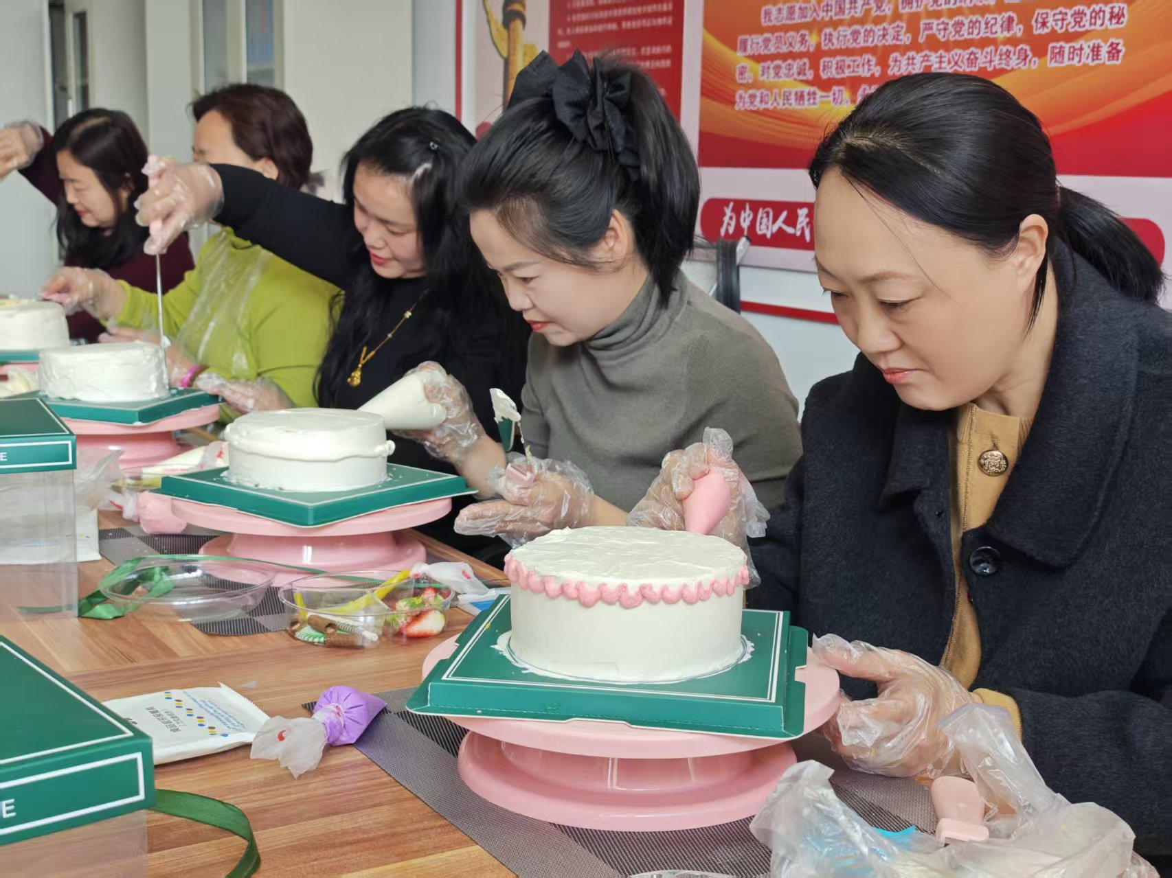 活动现场暖意融融,奶香四溢。支行提前布置了温馨的烘焙场地,专业烘焙导师早早就位,新鲜的蛋糕胚、绵密的奶油、缤纷的水果与精致裱花工具整齐摆放,静待女神们开启创作。活动开始,烘焙导师结合实操,详细讲解了奶油打发、抹面技巧、水果搭配与裱花装饰的核心步骤,耐心解答大家的疑问 。