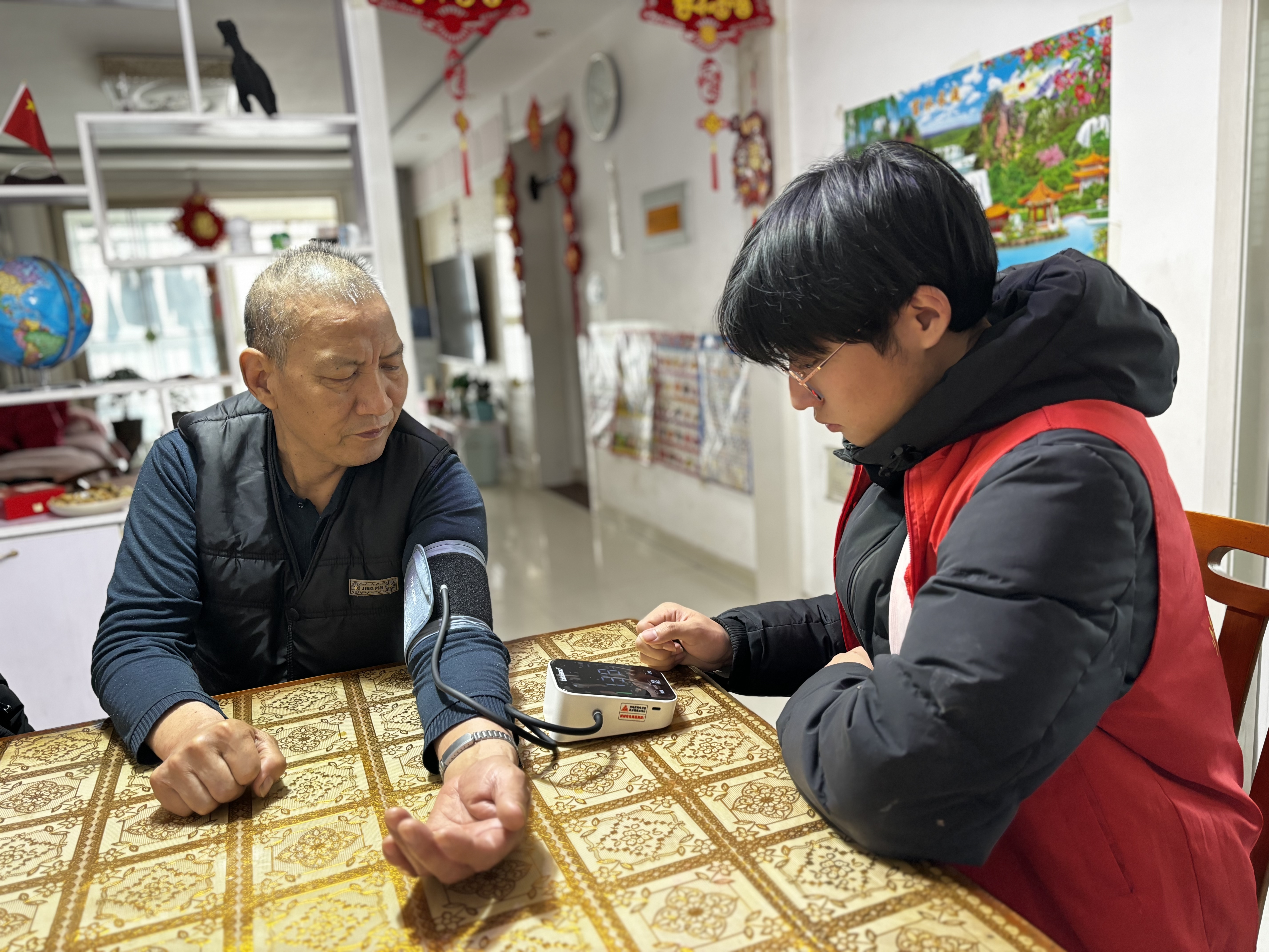 活动中,社区工作人员与大学生志愿者带着血压计等设备,逐一走进独居、高龄老人家中。志愿者们耐心搀扶老人、细心调试设备,认真为每一位老人测量血压,详细记录血压数值,细致询问老人的饮食、睡眠与日常用药情况,用通俗易懂的语言讲解高血压防治、日常养生等健康知识,叮嘱老人注意季节变化、合理膳食、适度锻炼。