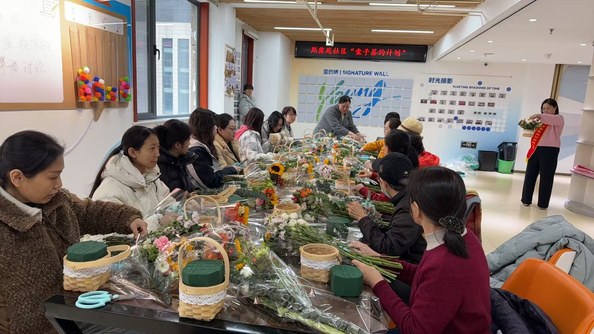 上午9时30分,熙霖苑社区“青年之家”活动室内花香四溢,欢声笑语。来自社区及共建单位的25位女性代表欢聚一堂,在专业花艺师的指导下,亲手制作属于自己的花艺作品。玫瑰的娇艳、康乃馨的温柔、配叶的灵动,在大家的巧手中组合成一件件精美的花艺作品。居民王女士捧着自己的作品欣喜地说:“平时忙于工作和家庭,很少有机会静下心来插花。今天不仅学到了花艺技巧,还感受到了百年人寿的贴心关怀,这个节日过得特别有意义。”