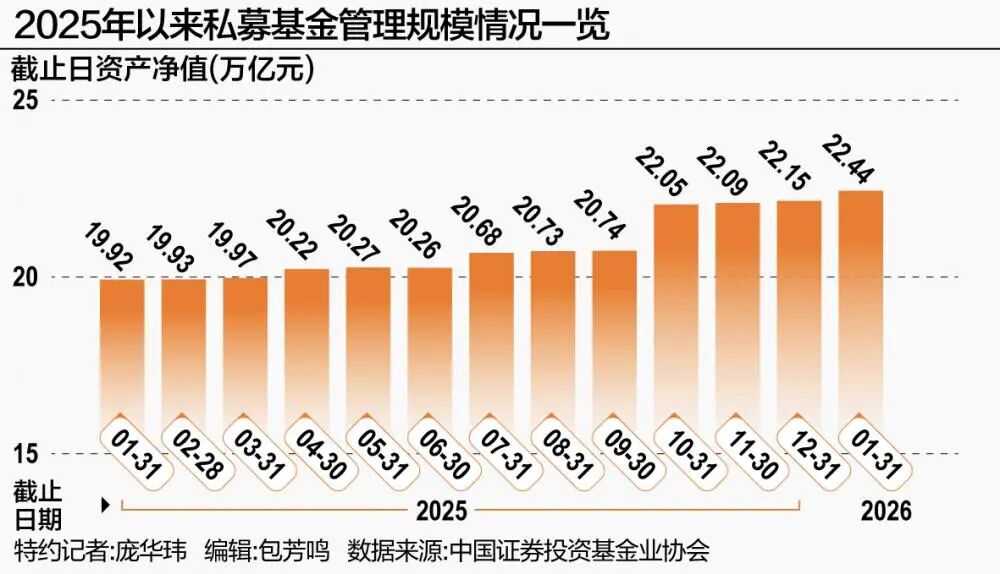 中国证券投资基金业协会(以下简称“中基协”)最新数据显示,截至2026年1月末,私募基金管理规模攀升至22.44万亿元,连续第四个月刷新历史纪录。