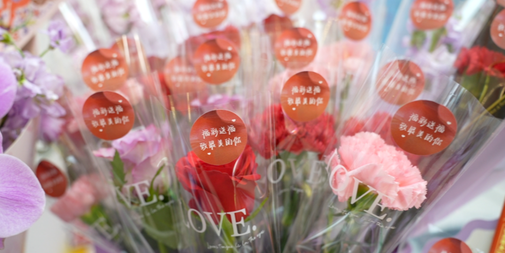 透过明净的橱窗,一束束由粉紫包装纸精心包裹的鲜花静静绽放,花束间点缀着“福彩送福 致最美的你”的红色祝福卡。最别致的是,每一束花中都巧妙穿插着几张刮刮乐彩票,如星星般闪烁其间,将节日的祝福与福彩的公益情怀悄然融合。
