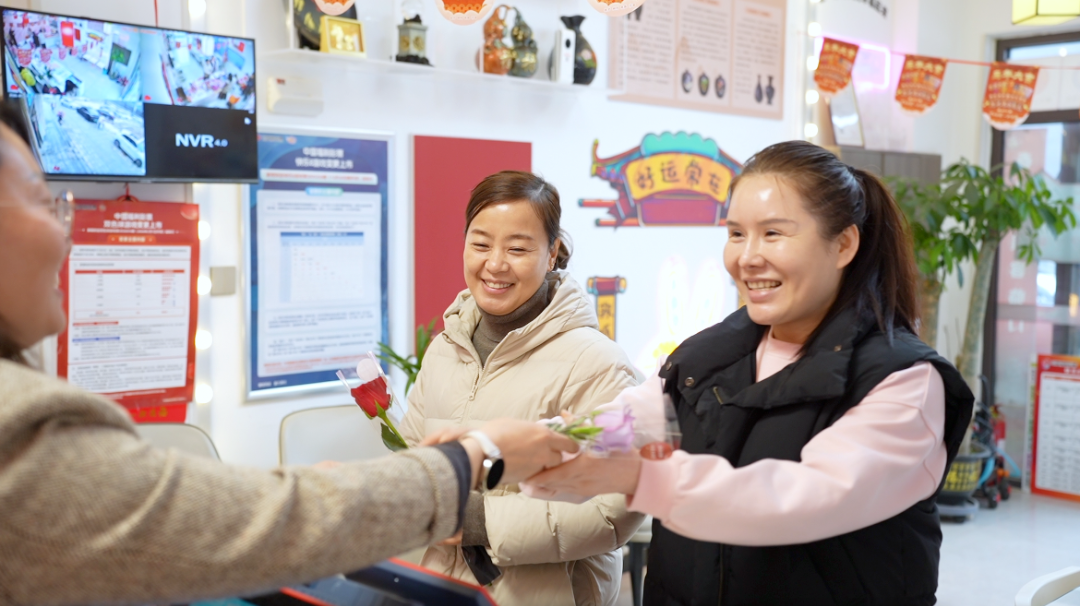 甄爱新将花束递到女业主王红霞手中,笑着说:“姐,您守着这个公益窗口,就是咱城里最美的‘福彩之花’。这花和艾草锤送给您,服务大伙儿的时候,也别忘了心疼自个儿。”
