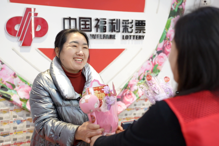 正说着,购彩者李女士推门而入。吴新辉从准备好的花束中抽出一枝玫瑰迎上前去:“姐,女神节快乐!您每买一张彩票,就是种下一颗爱心的种子。”