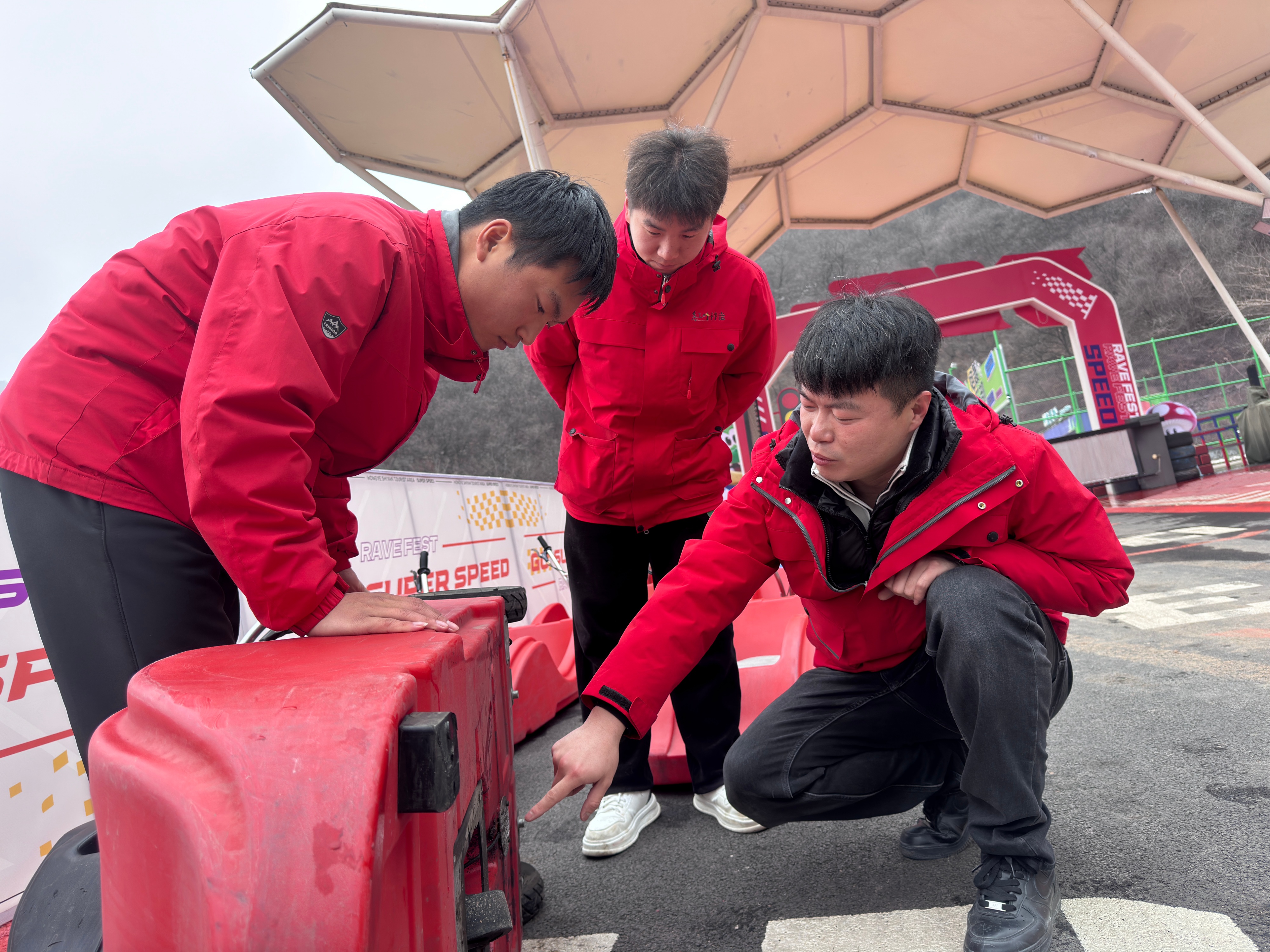 孙旭正在指导同事对山地滑车进行保养维护。