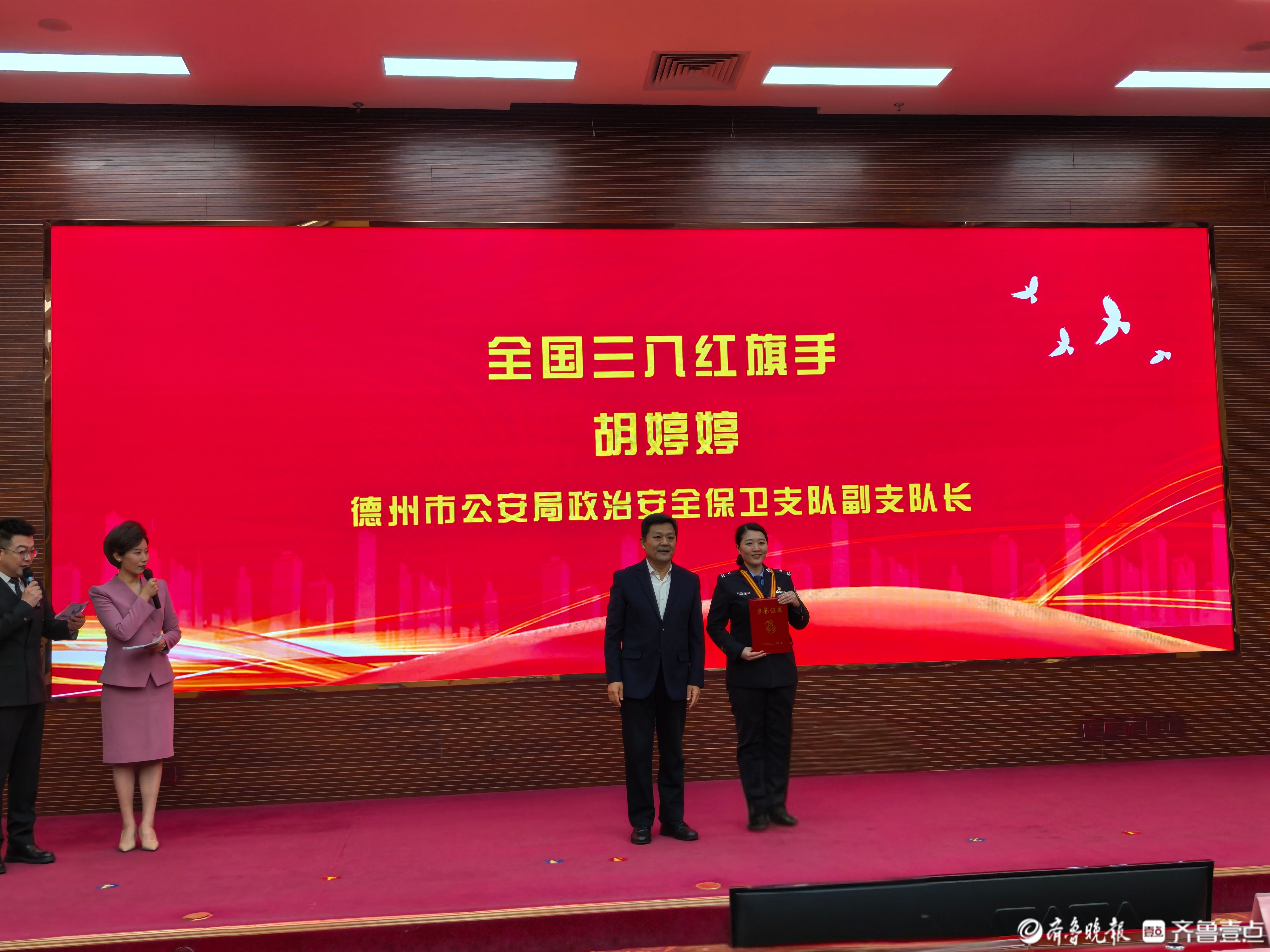 “全国三八红旗手”胡婷婷被授予证书。