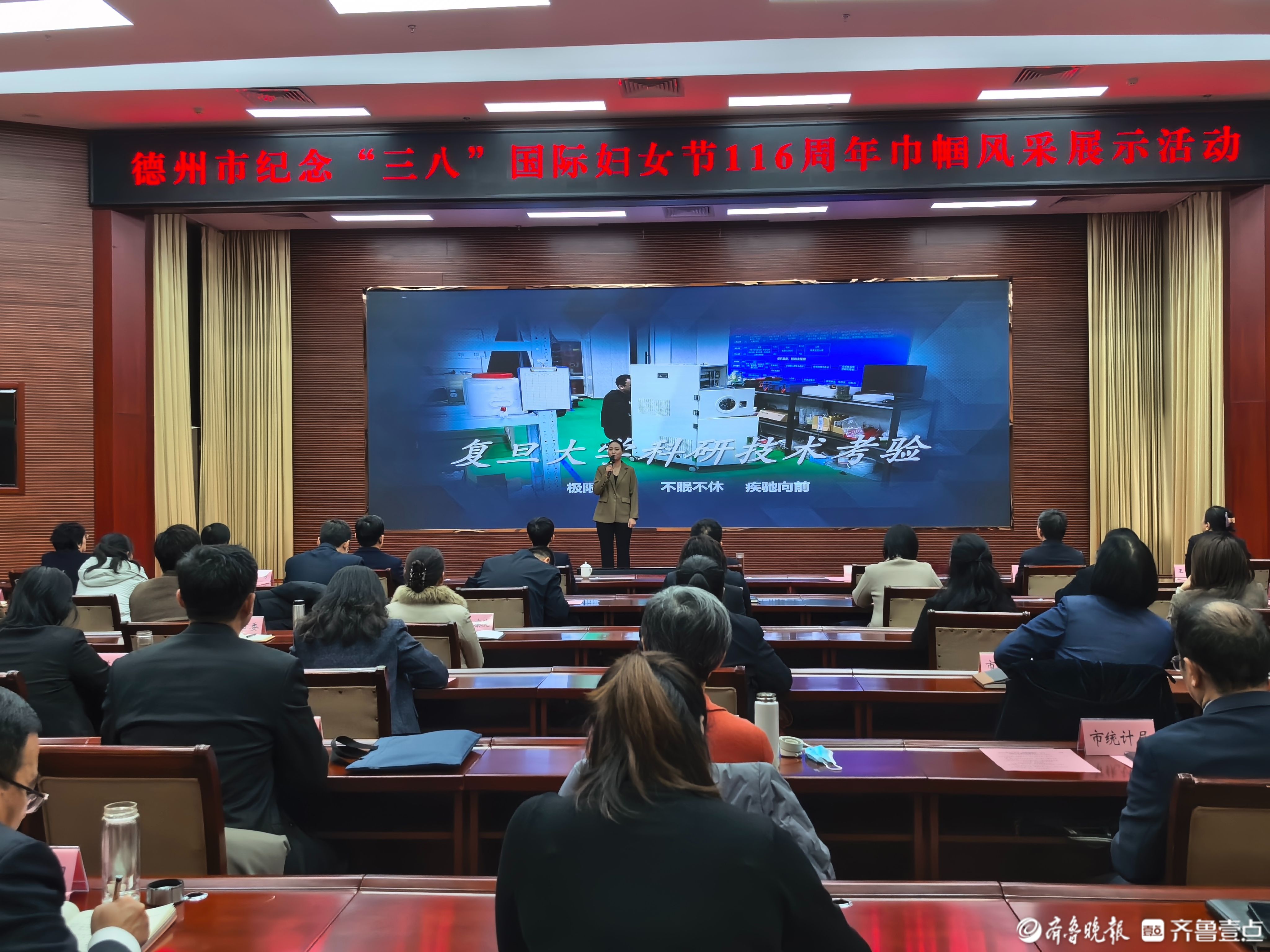 3月6日,德州市“实干开新局 巾帼建新功”纪念“三八”国际妇女节116周年巾帼风采展示活动现场进行事迹宣讲。