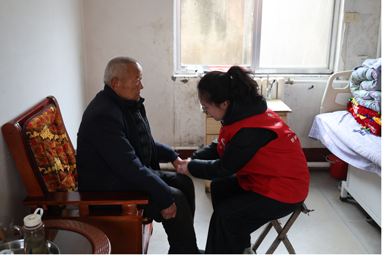 对于那些行动不便的残疾老人,年轻干部们细心地帮忙调整轮椅的角度,轻声询问日常起居的困难,认真记录下需要协调解决的康复需求。春日的暖阳洒在院内,映照着“志愿红”与“银发白”交织的温馨画面。