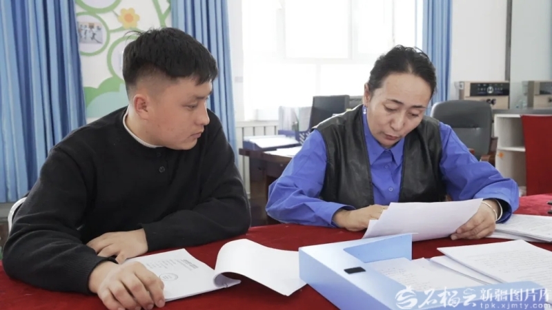 古丽米拉·达吾列提(右)在村委会与同事研究工作,对照文件梳理村集体发展思路。 胡阿尼什·那斯哈提 摄