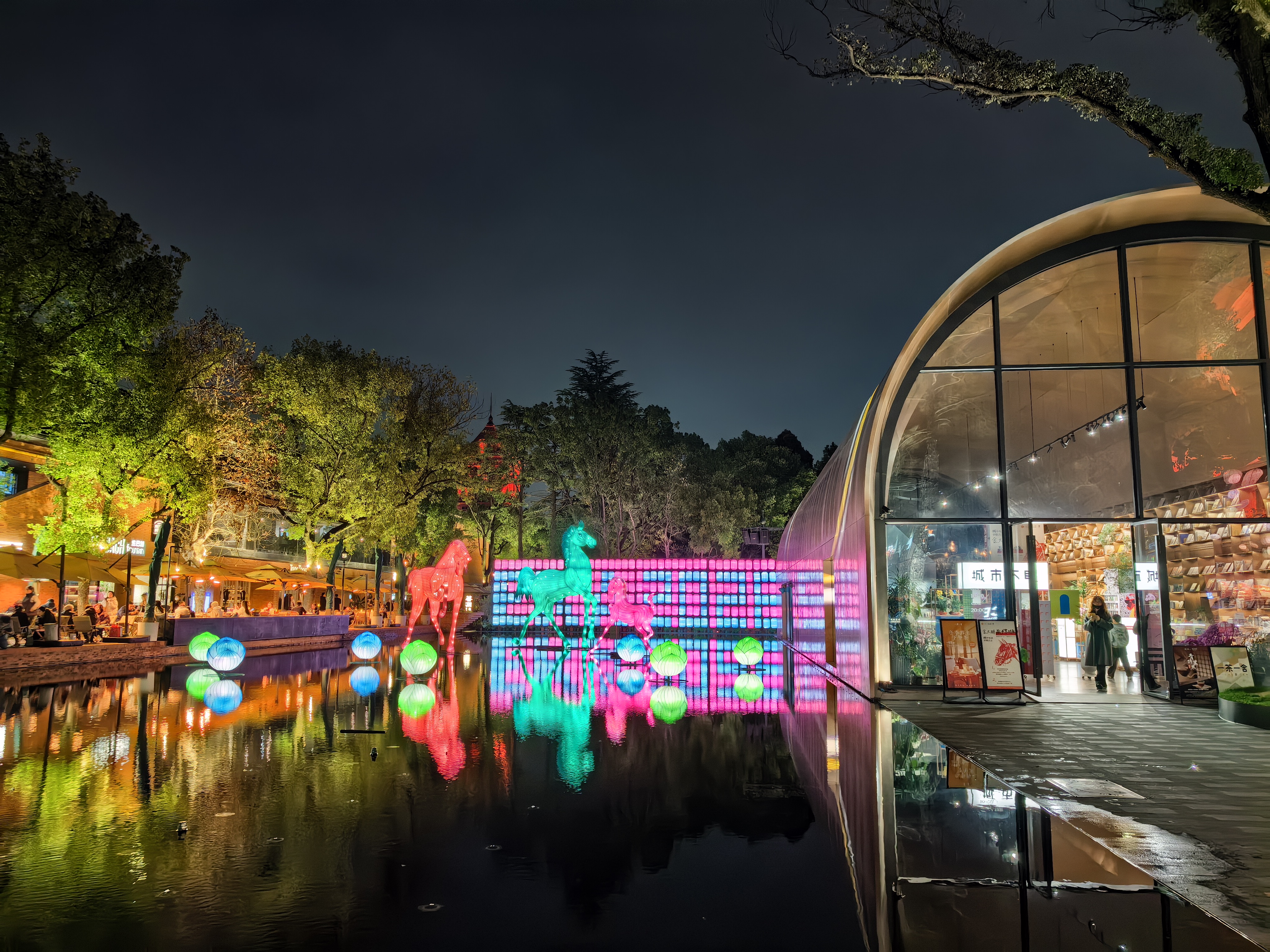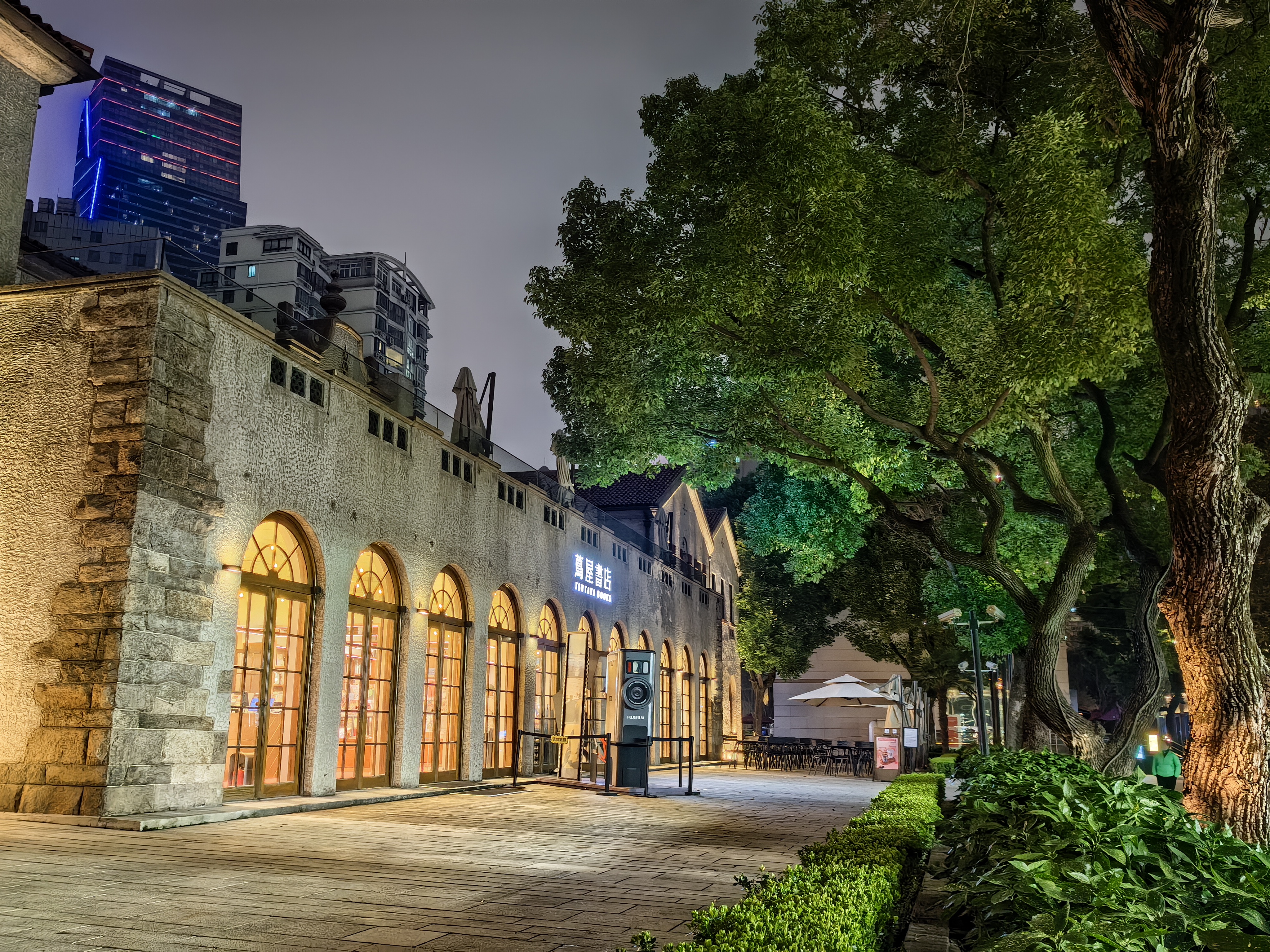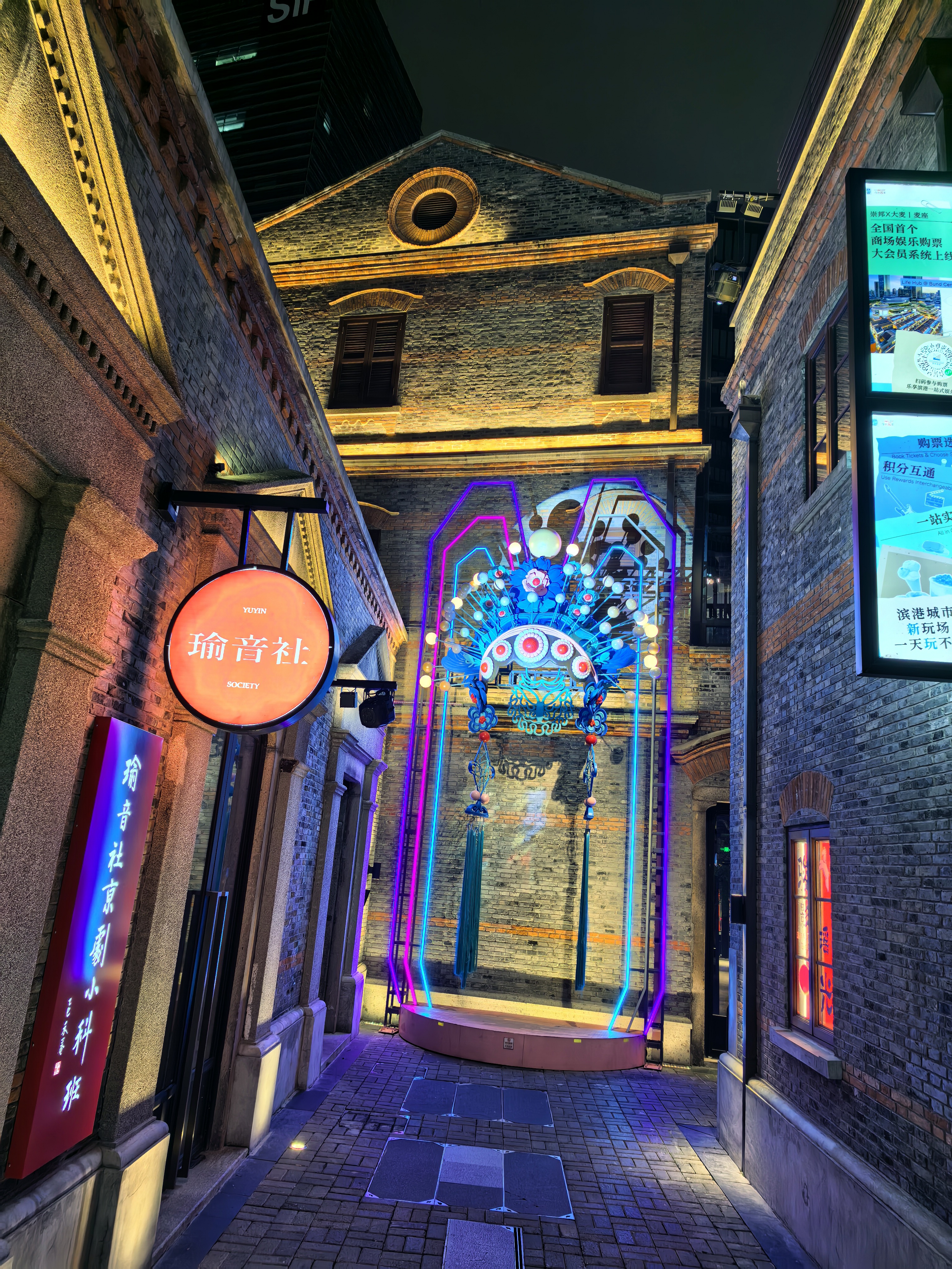 夜游最动人的,是历史与现代的完美共生。这里曾是侨民俱乐部,也曾是科研院所,如今变身成为潮流文艺街区。老建筑的复古肌理被完整保留,却又与茑屋书店的文艺、戏剧演出的鲜活、街头美食的烟火气巧妙相融。泳池边的餐厅飘出阵阵香气,年轻人围坐小酌,老建筑里流淌着真实的人间烟火。这种不突兀、不刻意的融合,让历史不再尘封,让潮流有了根基,也让我感知到上海特有的"海纳百川、新旧共生"的城市气质。作为一名高校教师,我常在课堂上与学生探讨城市更新的命题,而此刻置身其间,才真正觉得,最好的答案从来不在书本里,而在脚下这片活着的土地上。