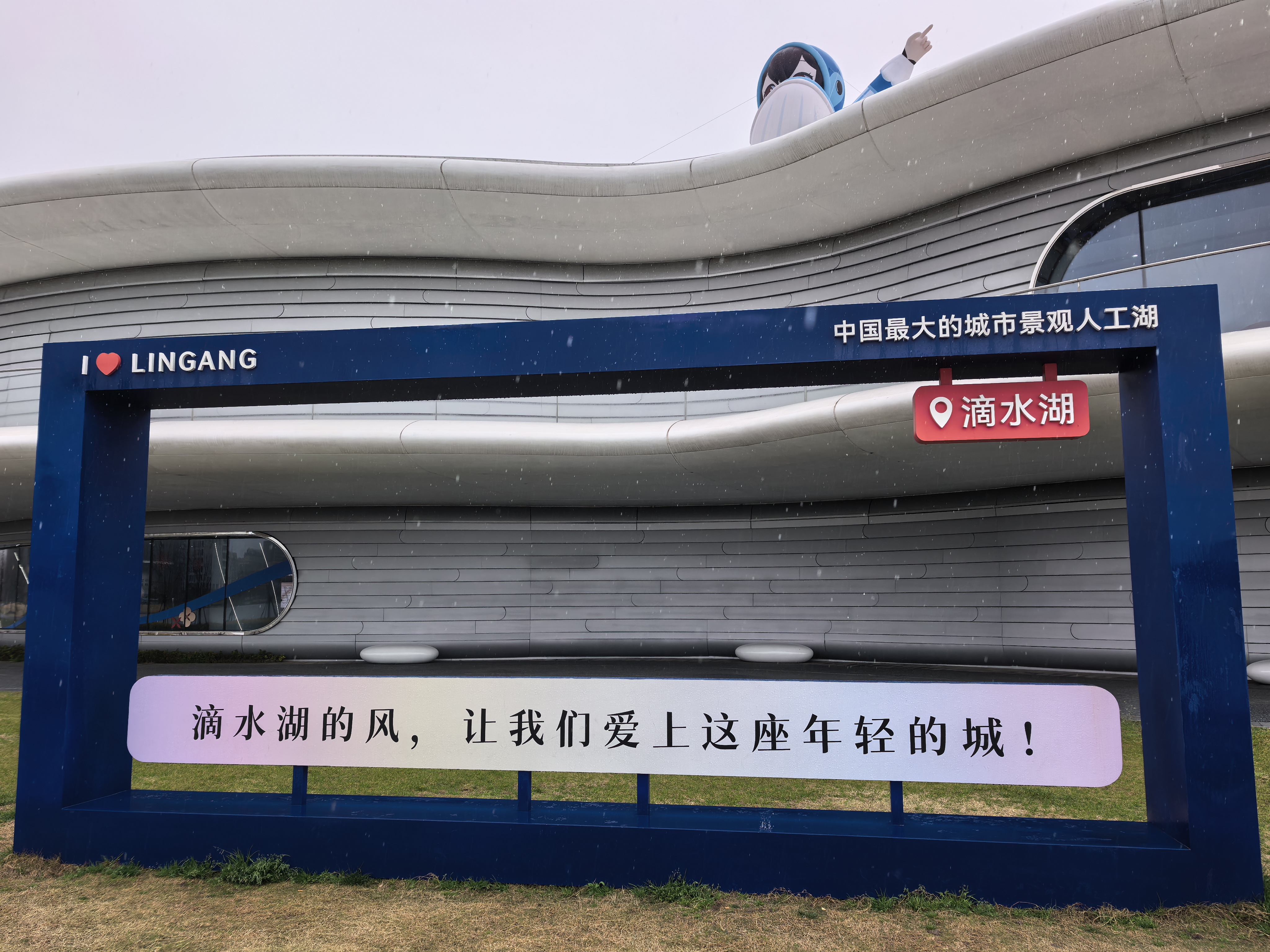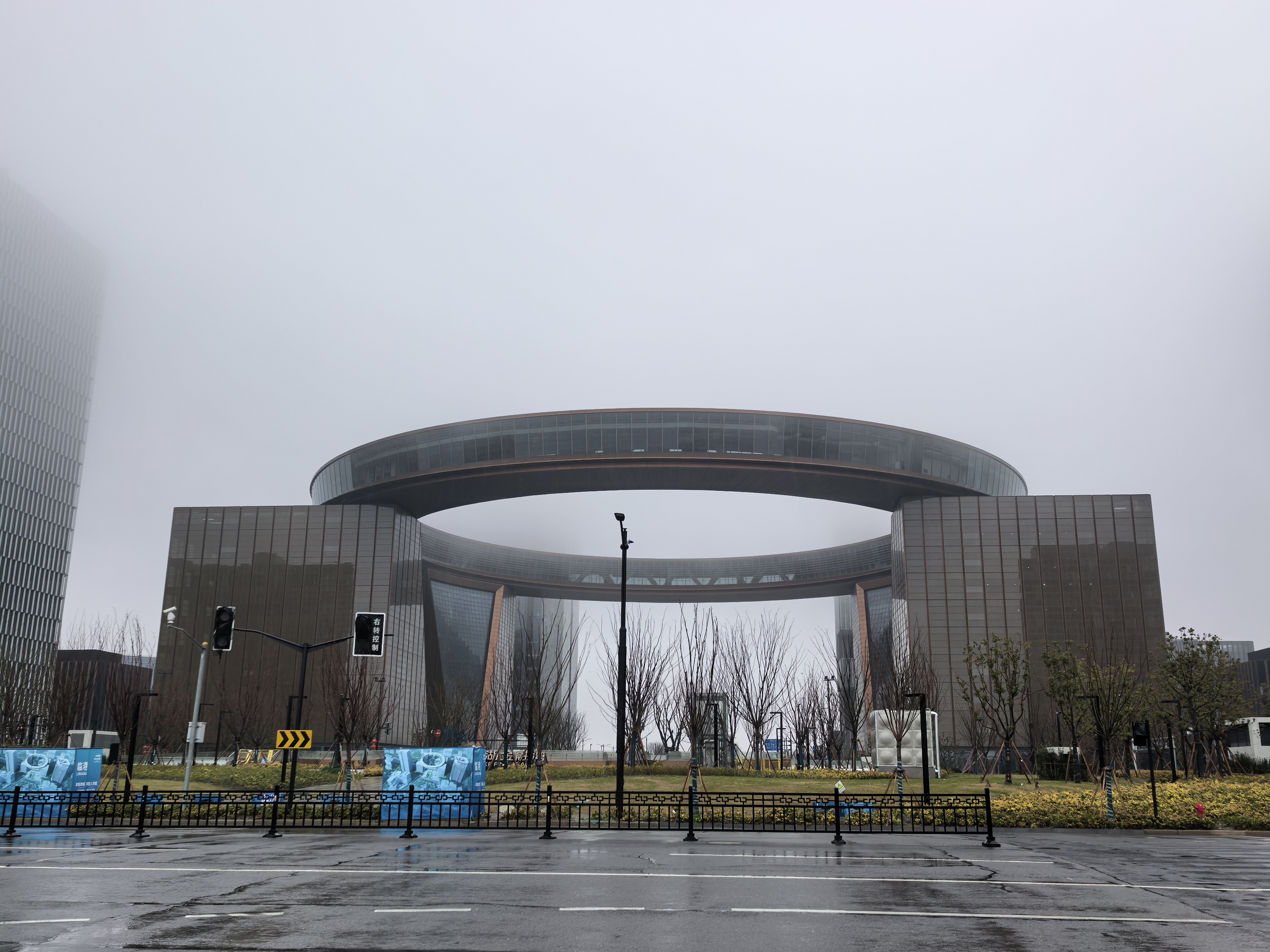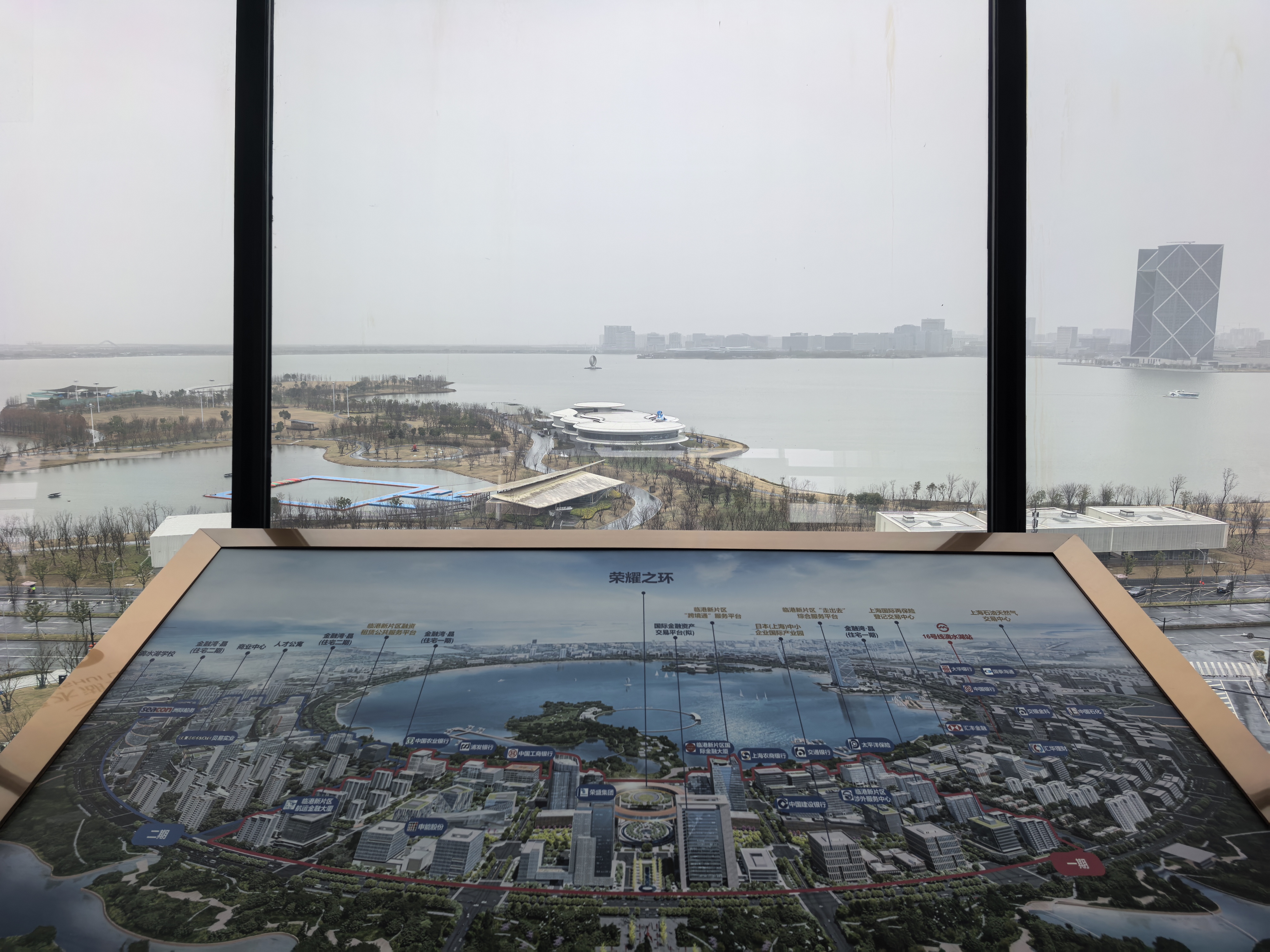 今天虽然下雨,但仍按约定时间出发。适逢周日,路上车稀人少,一个小时的时间,从主城区就到了浦东新区南汇新城镇的中国自贸区临港新区。第一站便是滴水湖金融湾的核心地标——荣耀之环。它是一个直径约150米的环形透明建筑,拥有5000平米环绕体验空间,从56米高空可以俯瞰全湖。因事先有约,到了楼下,已有工作人员在此等候并引领我们登上了“荣耀之环”。