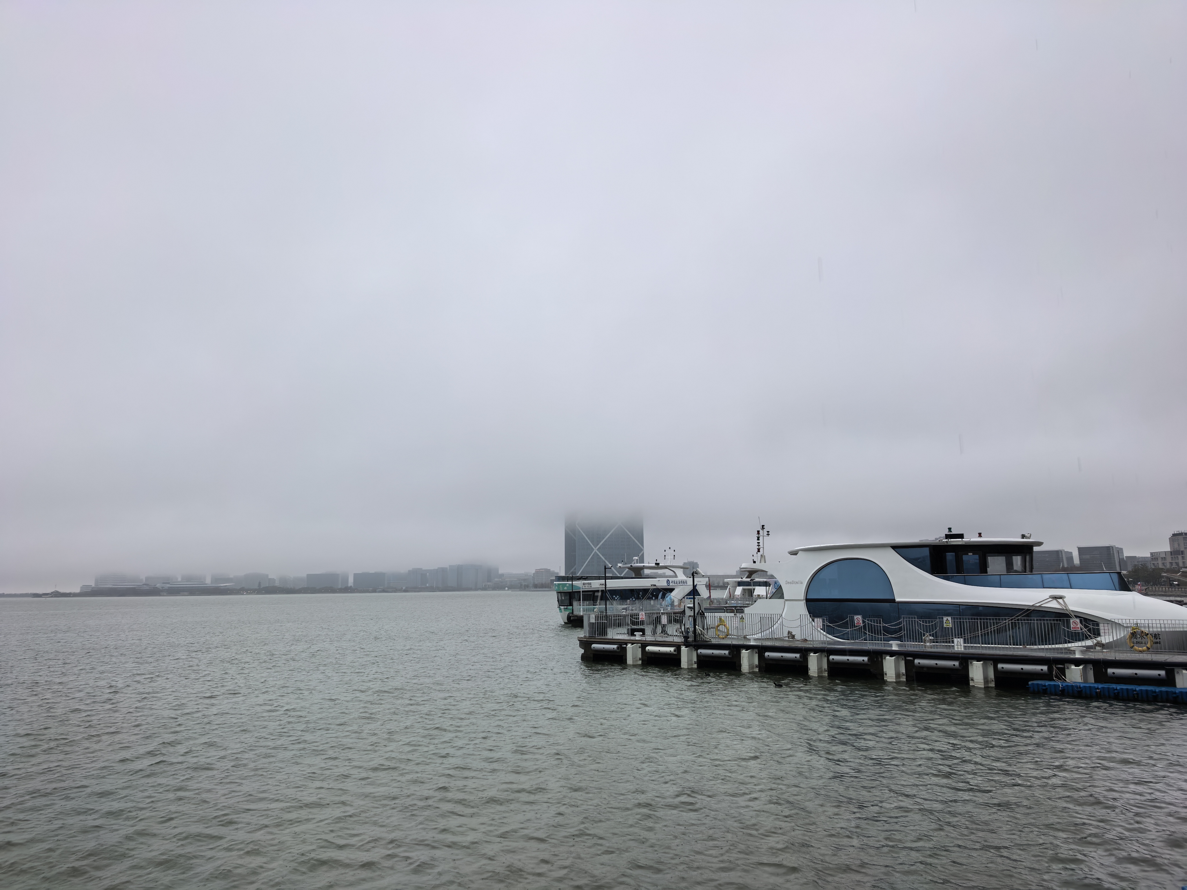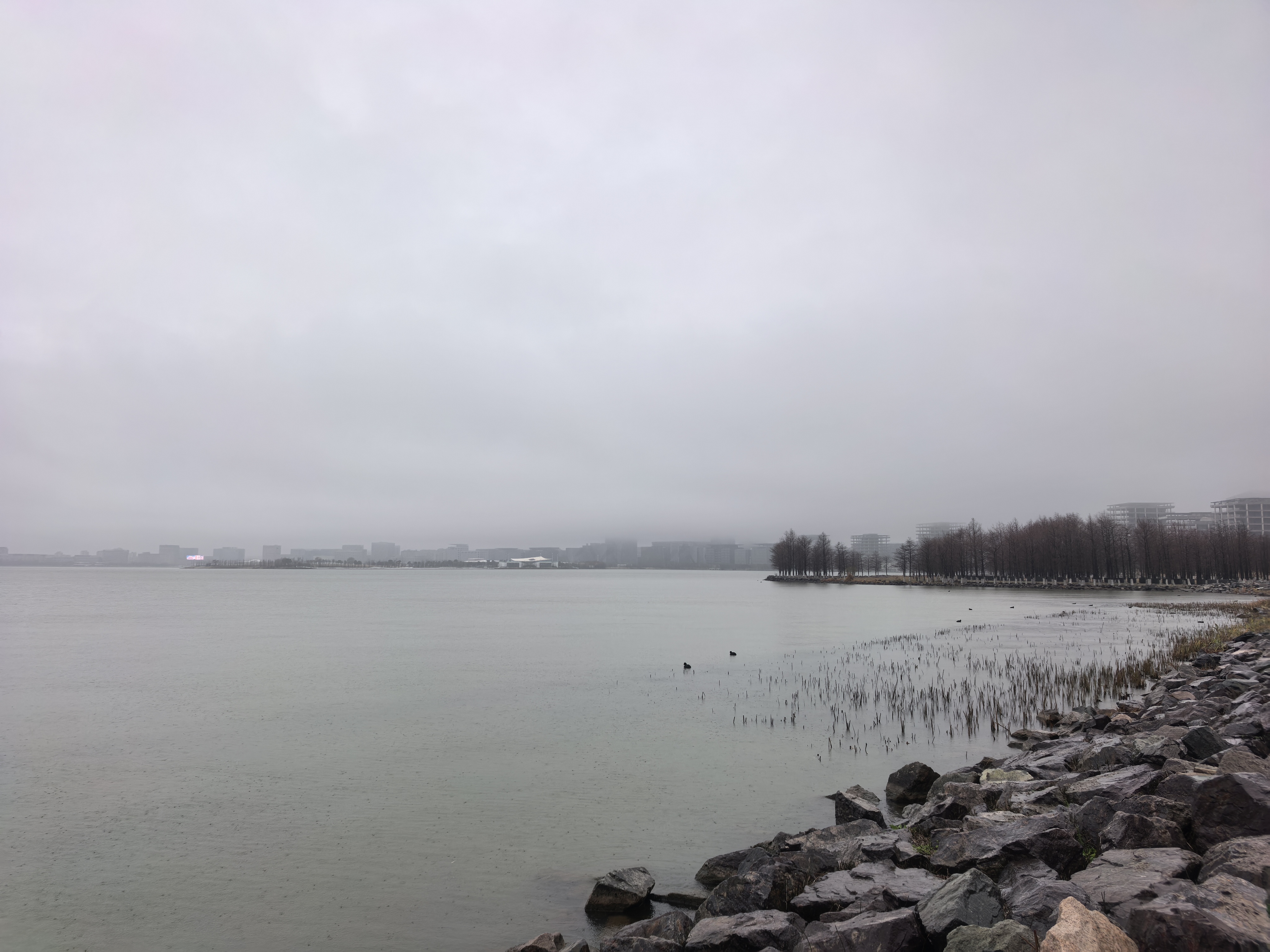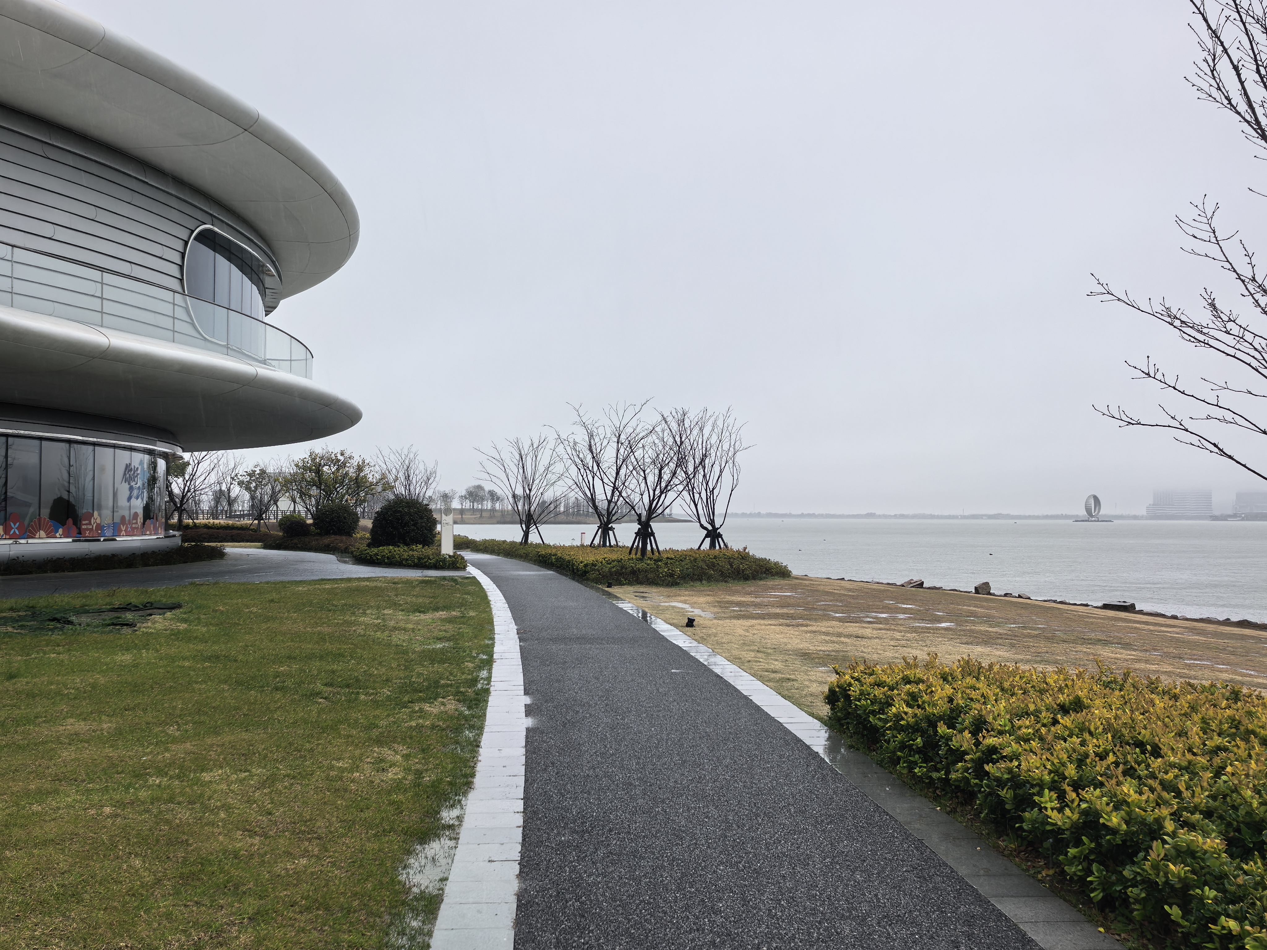 看完地标性的荣耀之环,我们环湖漫步。雨天的滴水湖,少了晴日的明媚,却多了几分清冷又温柔的诗意。细雨朦胧,湖面被雨雾轻轻笼罩,天水一色,天地都变得安静辽阔。原来,雨天游湖不是遗憾,而是一场独属的浪漫。雨丝拂面,凉却不冷,风声、雨声、湖水轻拍岸边的声音交织在一起。一步一景,让人不觉静下心来感受这片湖的大气与温柔。湖面被细雨叩击,泛起一圈圈细碎的涟漪,层层叠叠,缓缓散开;偶有飞鸟掠过雨幕,留下一道轻盈的剪影,为这份静谧平添几分灵动。湖中的帆船爱好者雨中乘风而行,更为这雨幕中的滴水湖增添了一帧生动的画面。