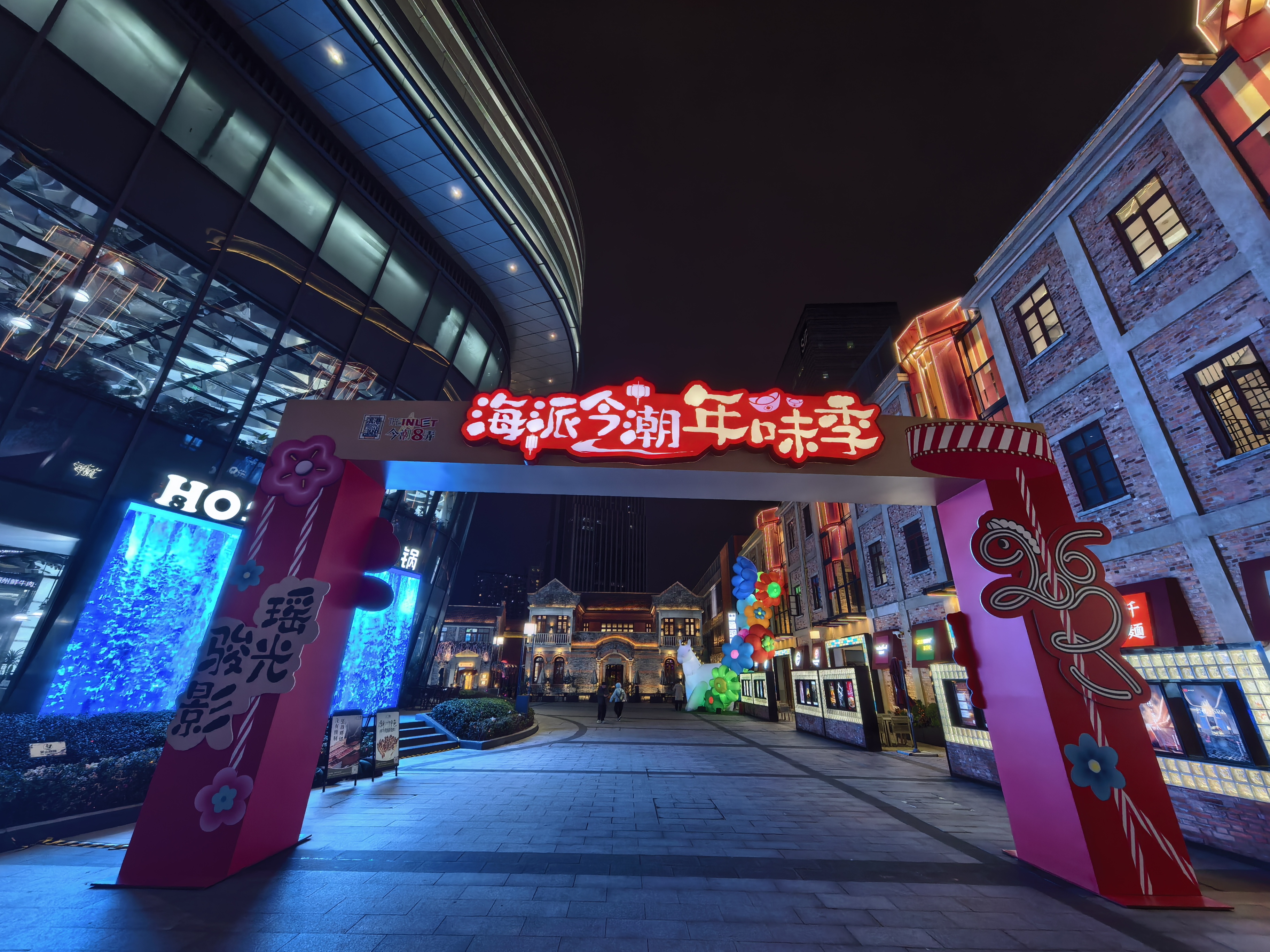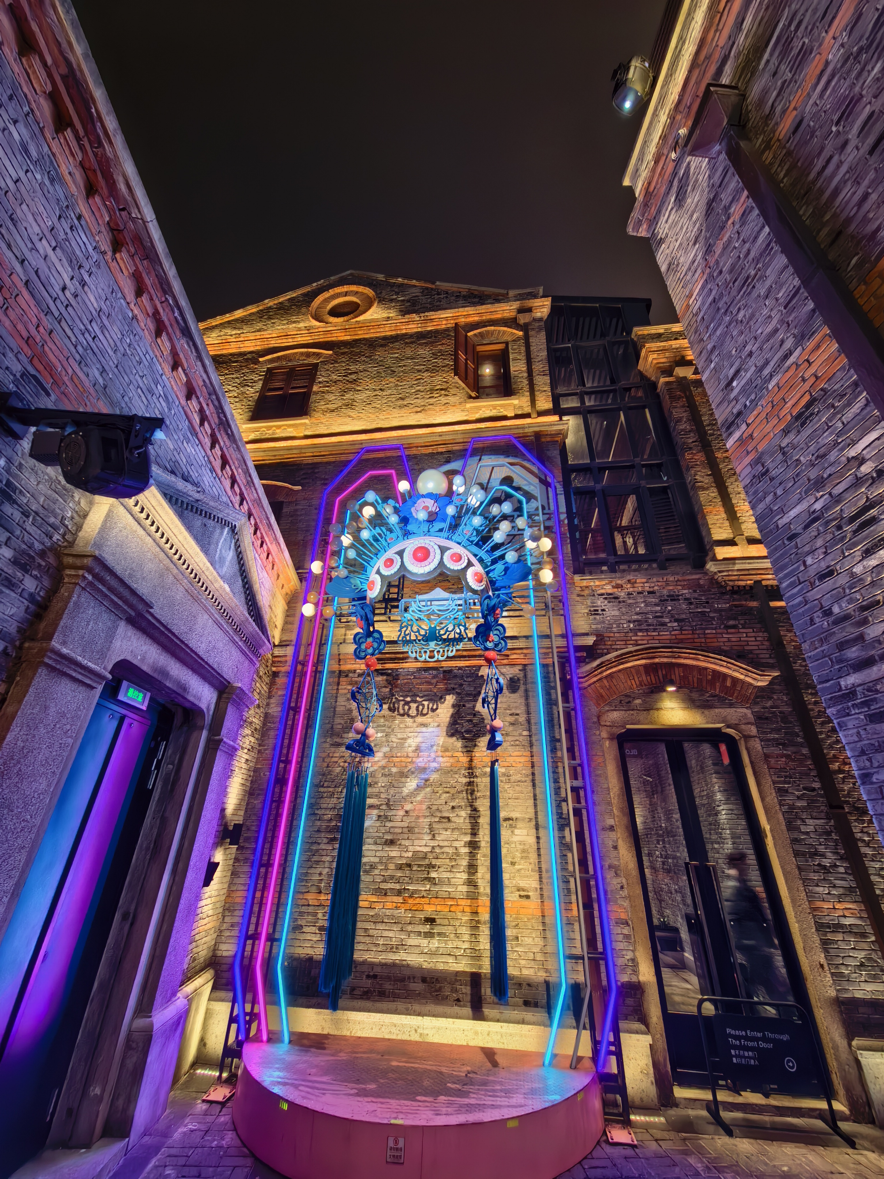 步入弄堂,那些历经百年风雨却依旧挺立的石库门建筑愈发显得古朴庄重。深灰色的砖墙,厚重的石库门,门楣上精美的雕花,无不诉说着往昔的辉煌与故事。“THE INLET 今潮8弄”的霓虹招牌在夜色中流转着红蓝紫的光芒,仿佛也在低语着百年的变迁。行人们或驻足拍照,或低声交谈,笑声与光影交织,构成了一幅生动的节日图景。